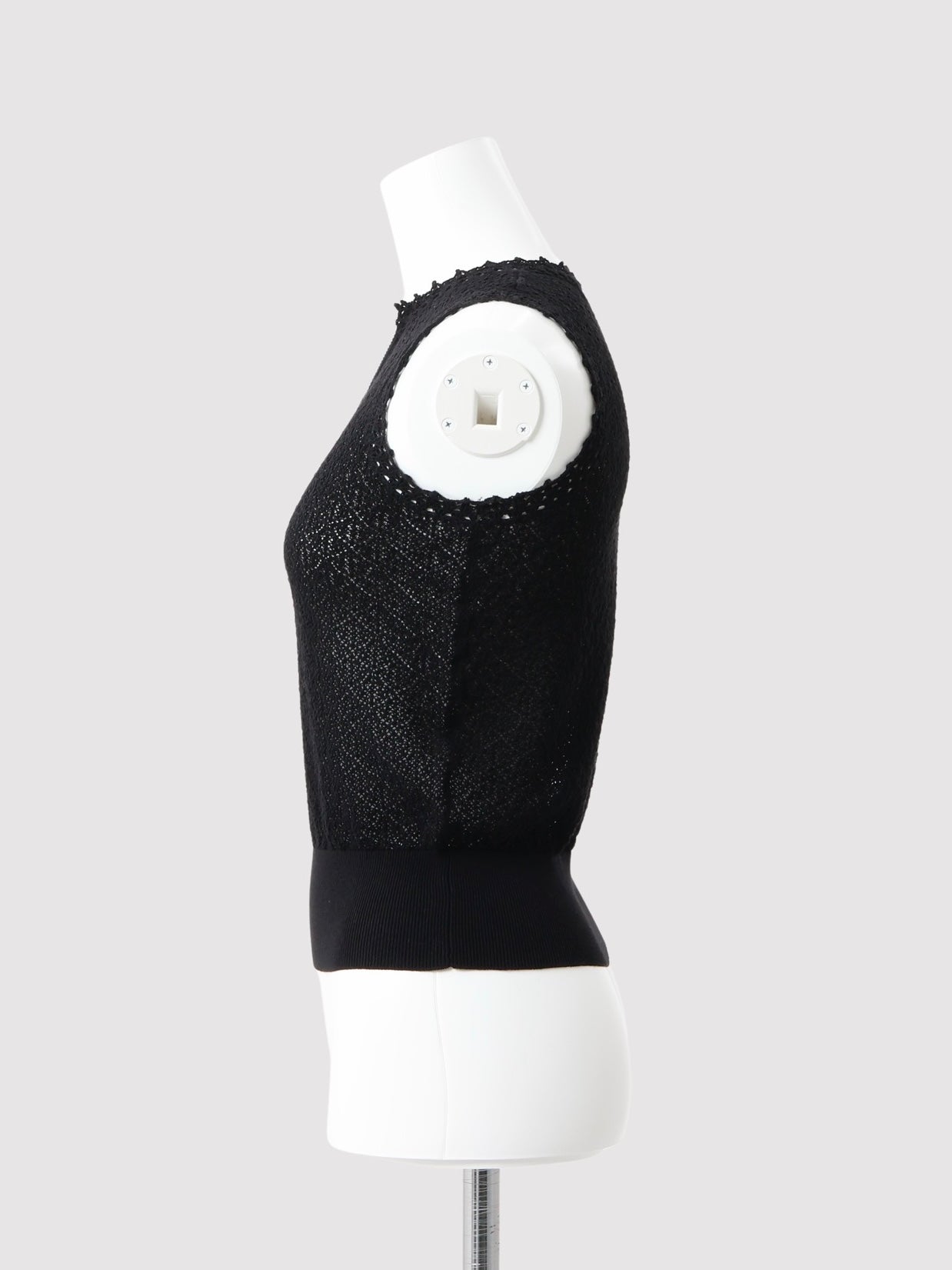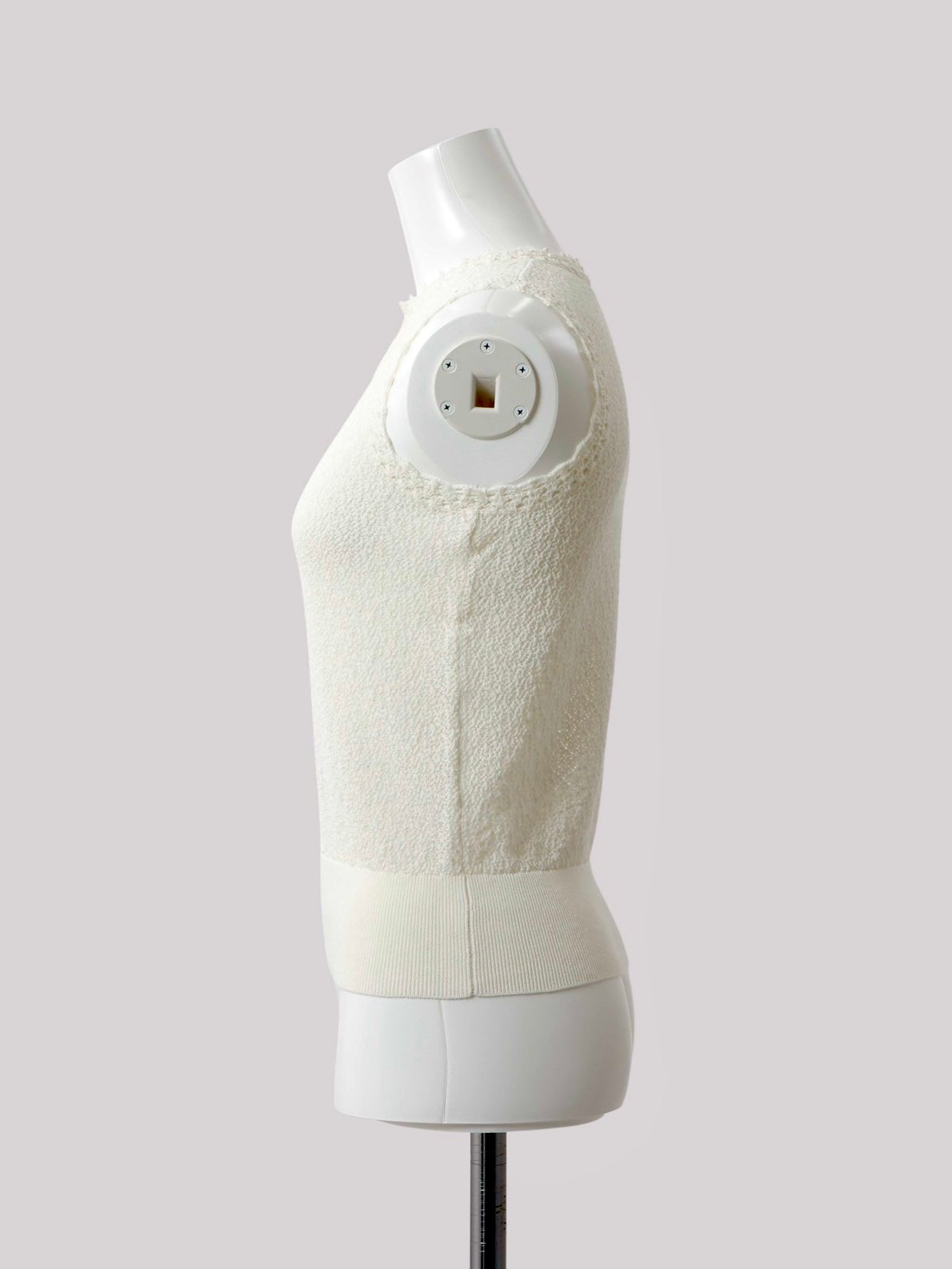 襟と袖口のレースは、すべて手編みで丁寧に仕立てた一枚。ボディは機械編みながらも、レースとのコントラストが美しく映えるよう、立体感を意識して設計したオリジナル柄を採用。甘さだけに寄らない、凛とした佇まいに仕上げています。
