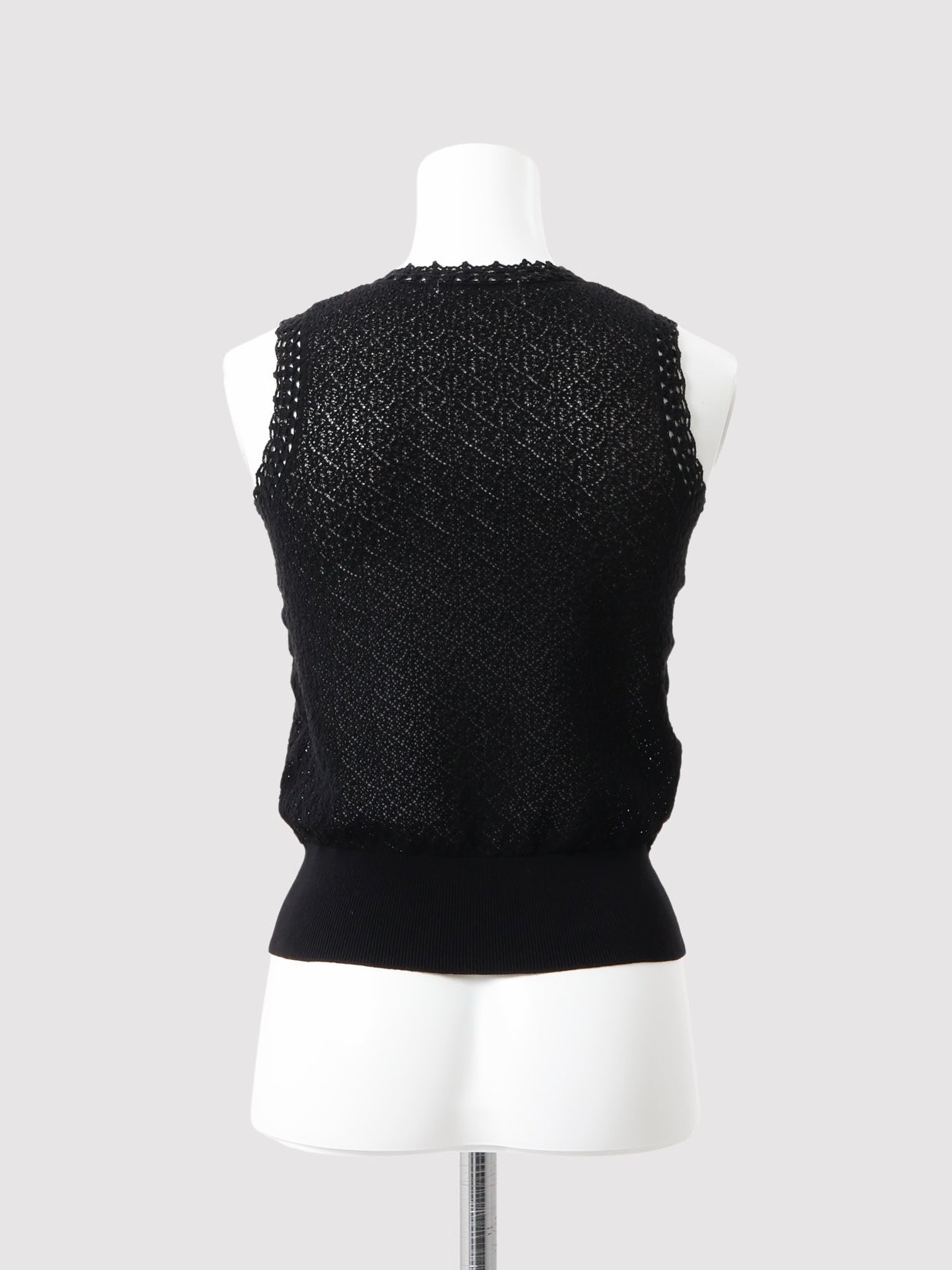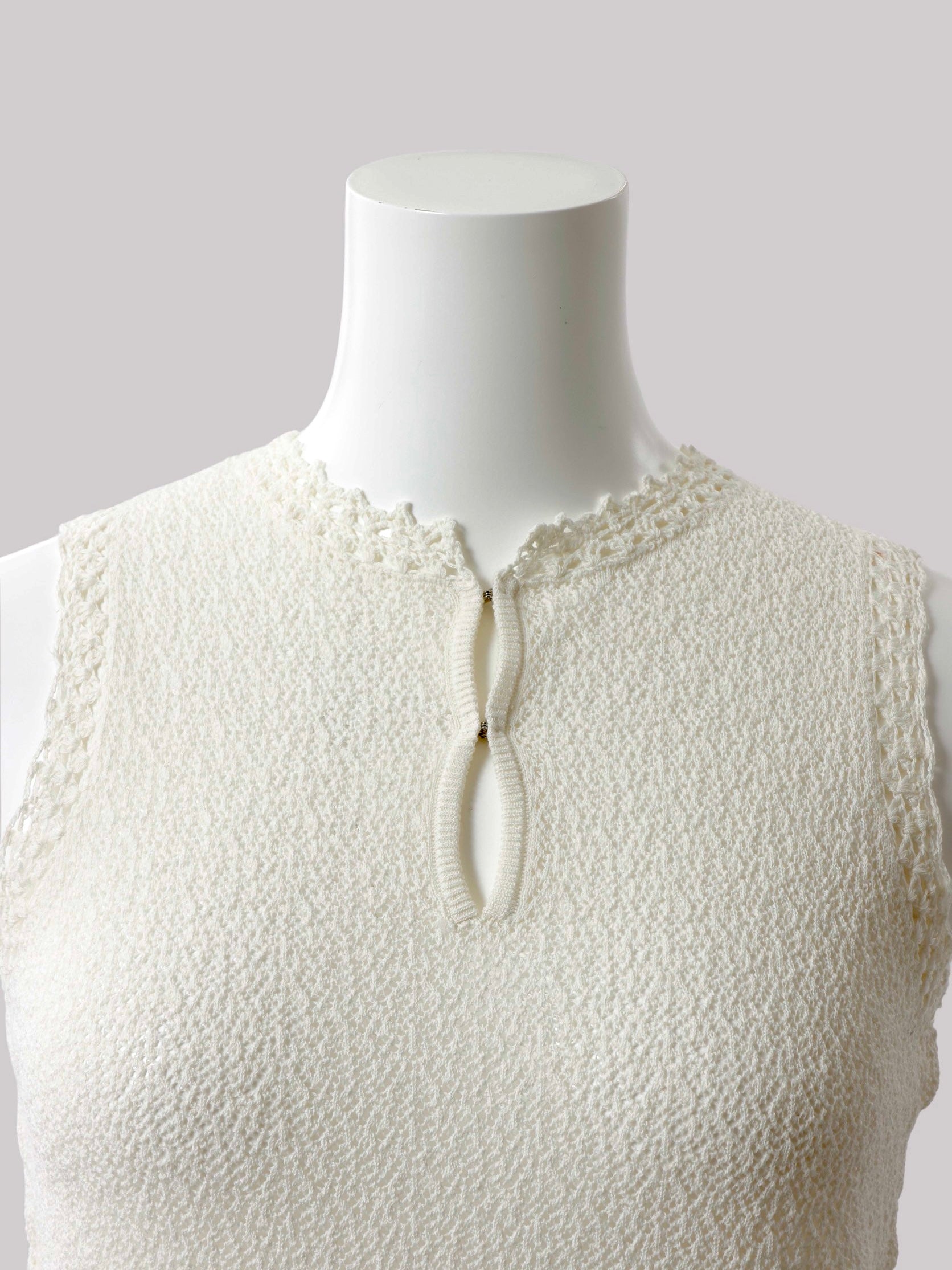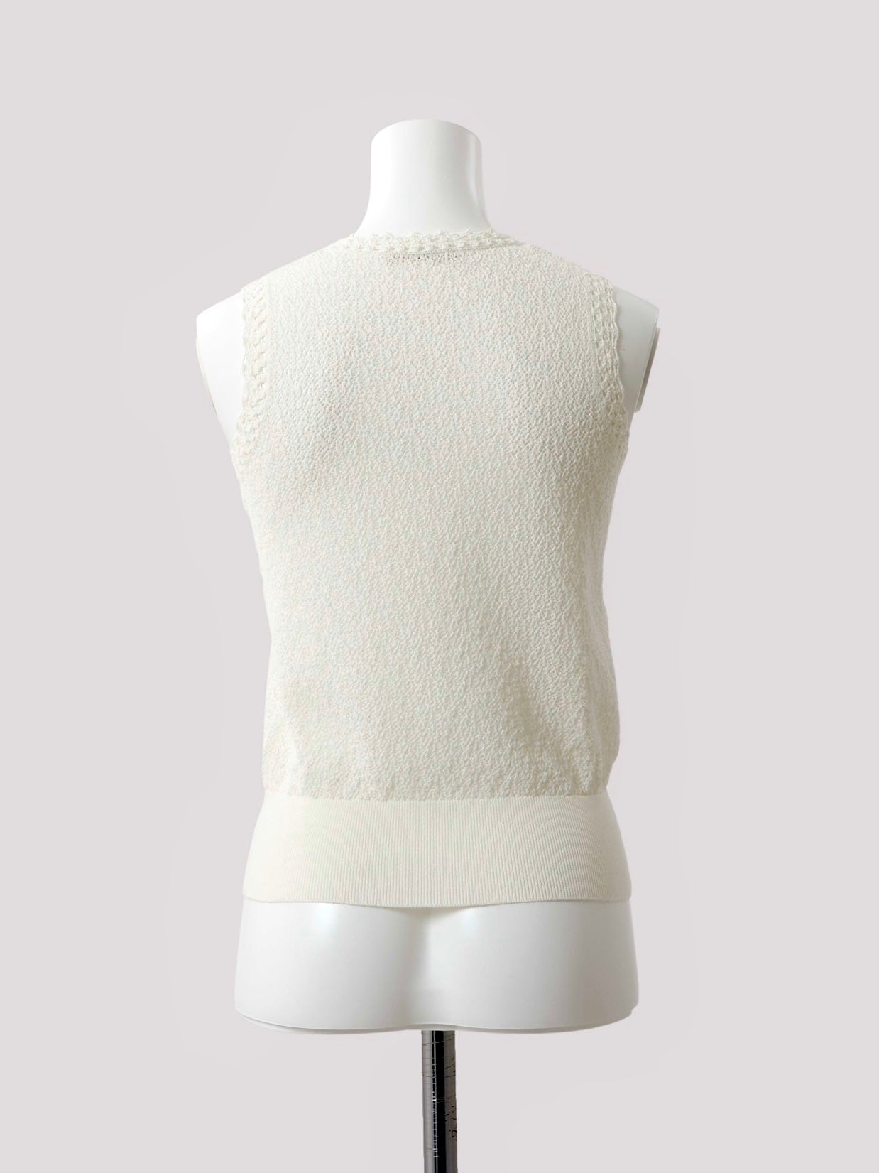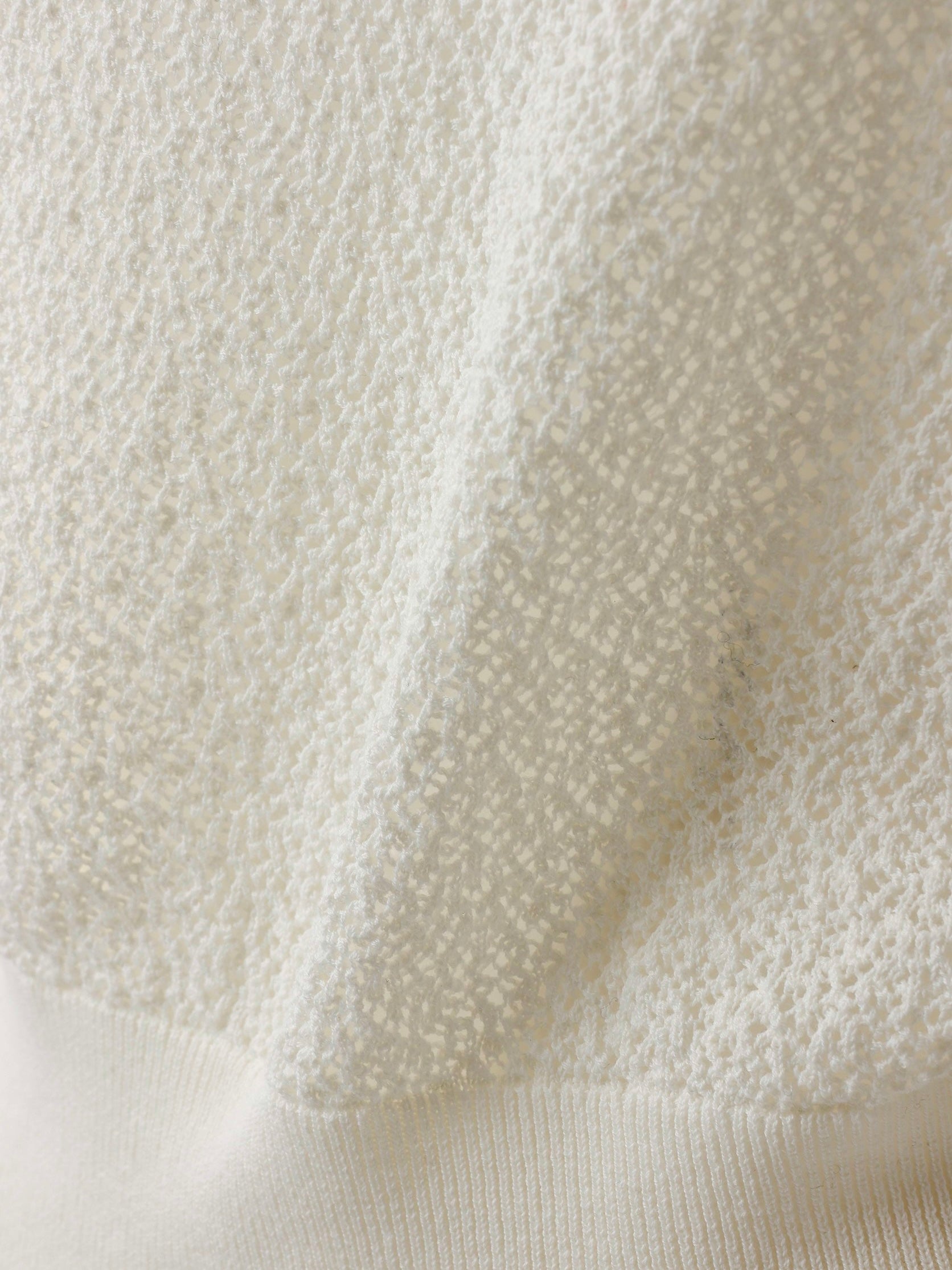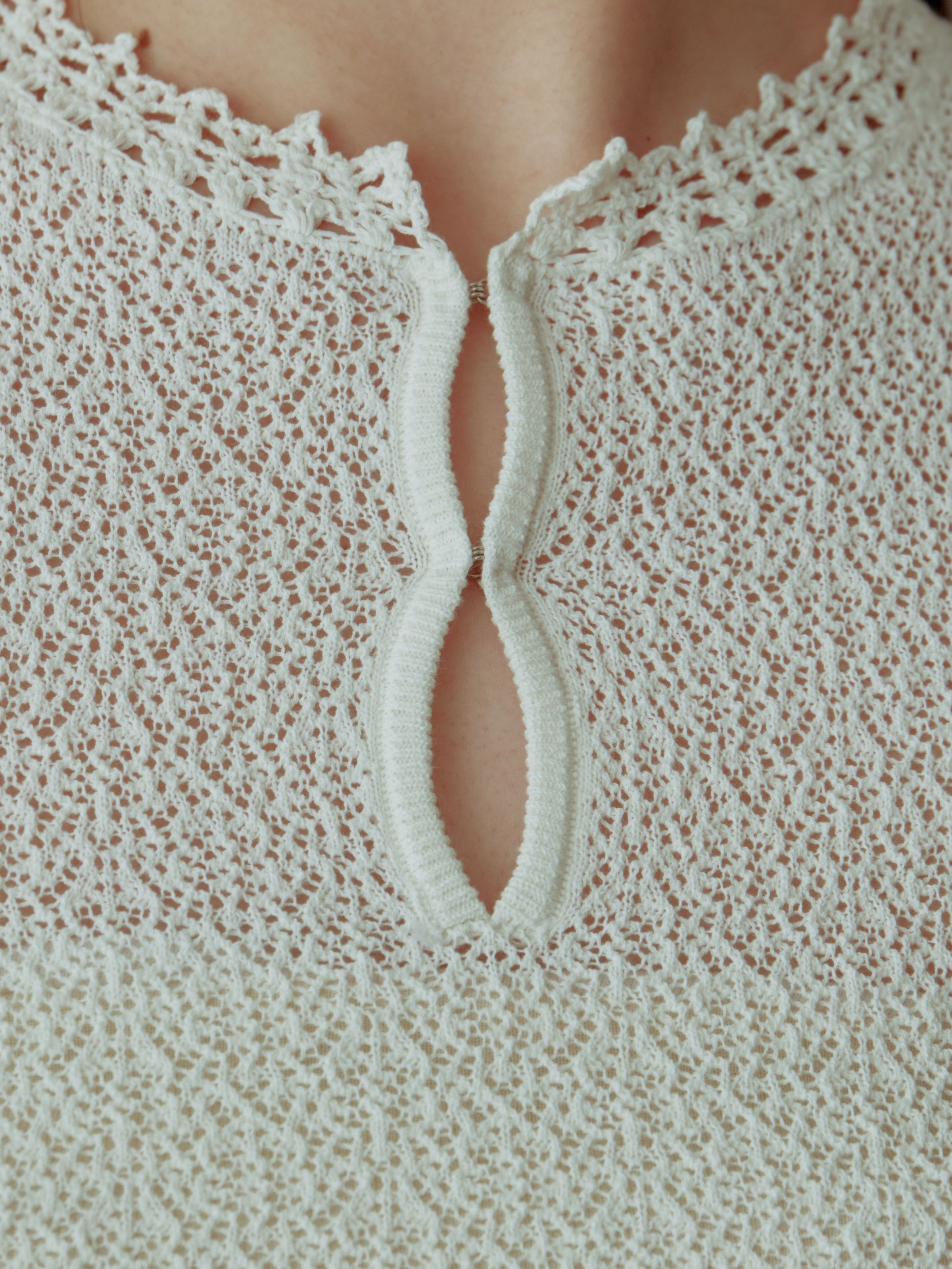 全体を占めるベースとなる編み柄はオリジナルで構築した可憐な模様が品良く透ける。襟と袖口のレースディティールは手編みで仕上げられ、繊細な立体感から丁寧な職人技が宿る一着に。異なるアプローチによって生まれる表情の違いを楽しめます。