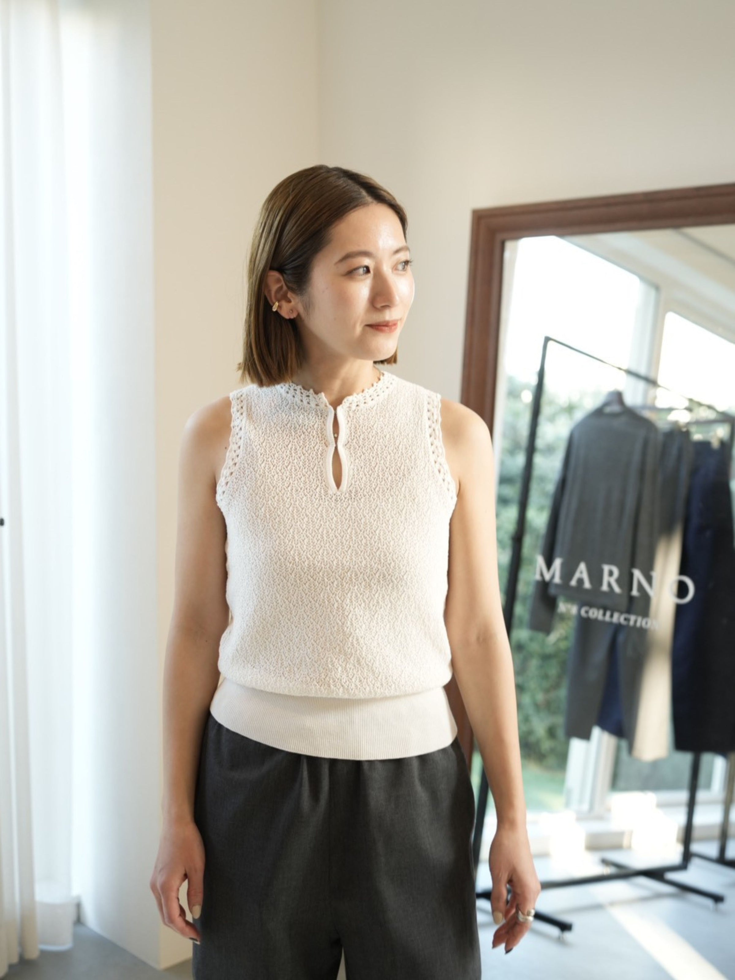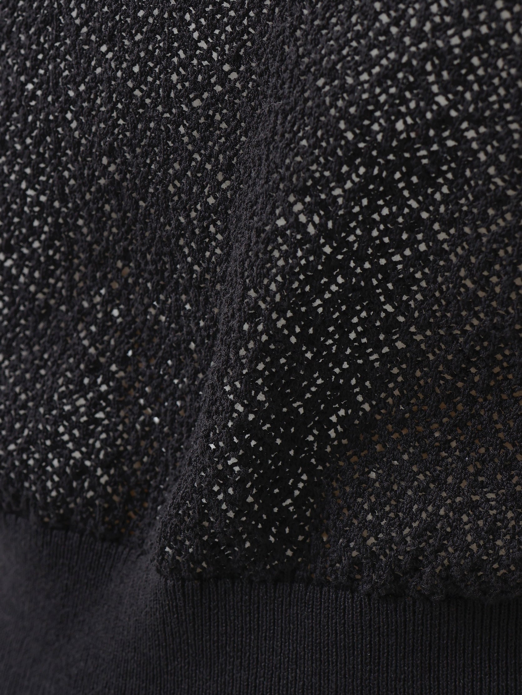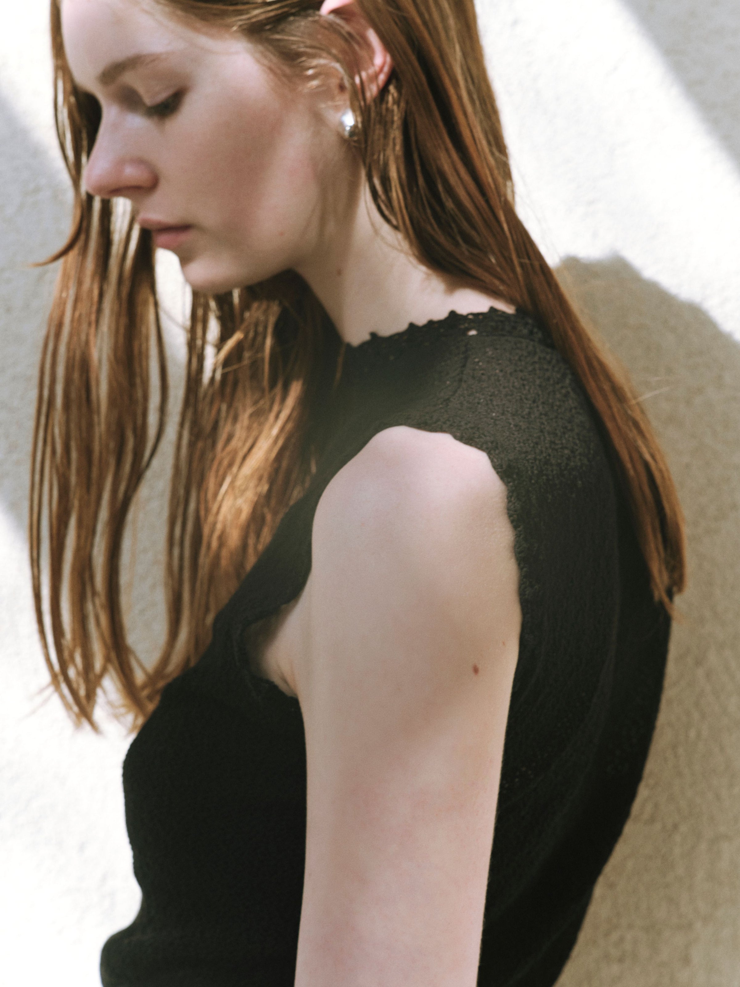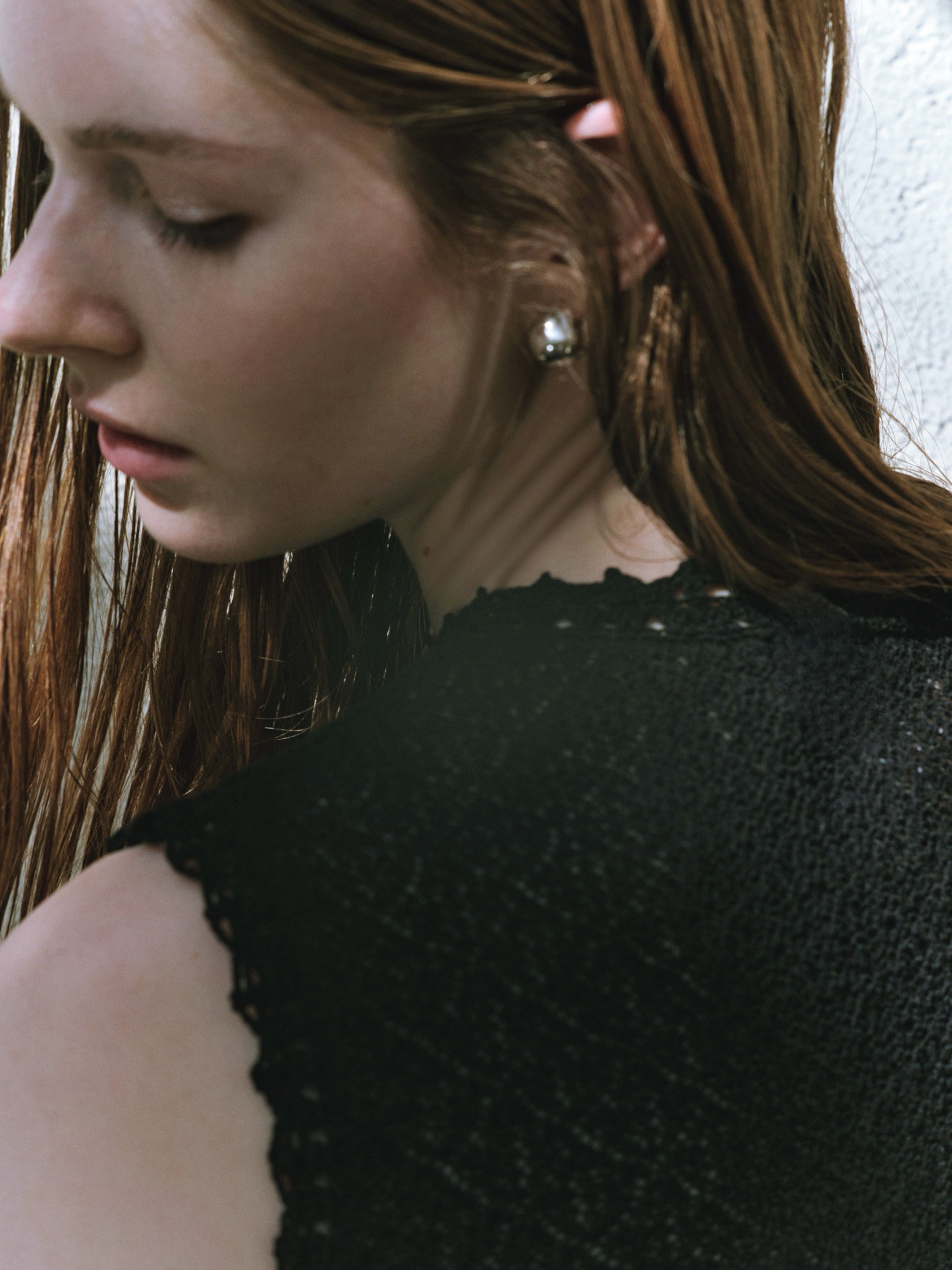 胸元のさりげない開きと、程よくコンパクトなシルエットがボトムとのバランスを取りやすく、一枚で自然とスタイリングが完成するデザイン。ウールのRémi pantsと合わせれば、静かで上品なムードに。Yves denimと合わせることで、程よく力の抜けたスタイリングも楽しめます。デイリーからオケージョンまで、シーンを選ばず活躍する、着映えと実用性を兼ね備えたレースニットです。