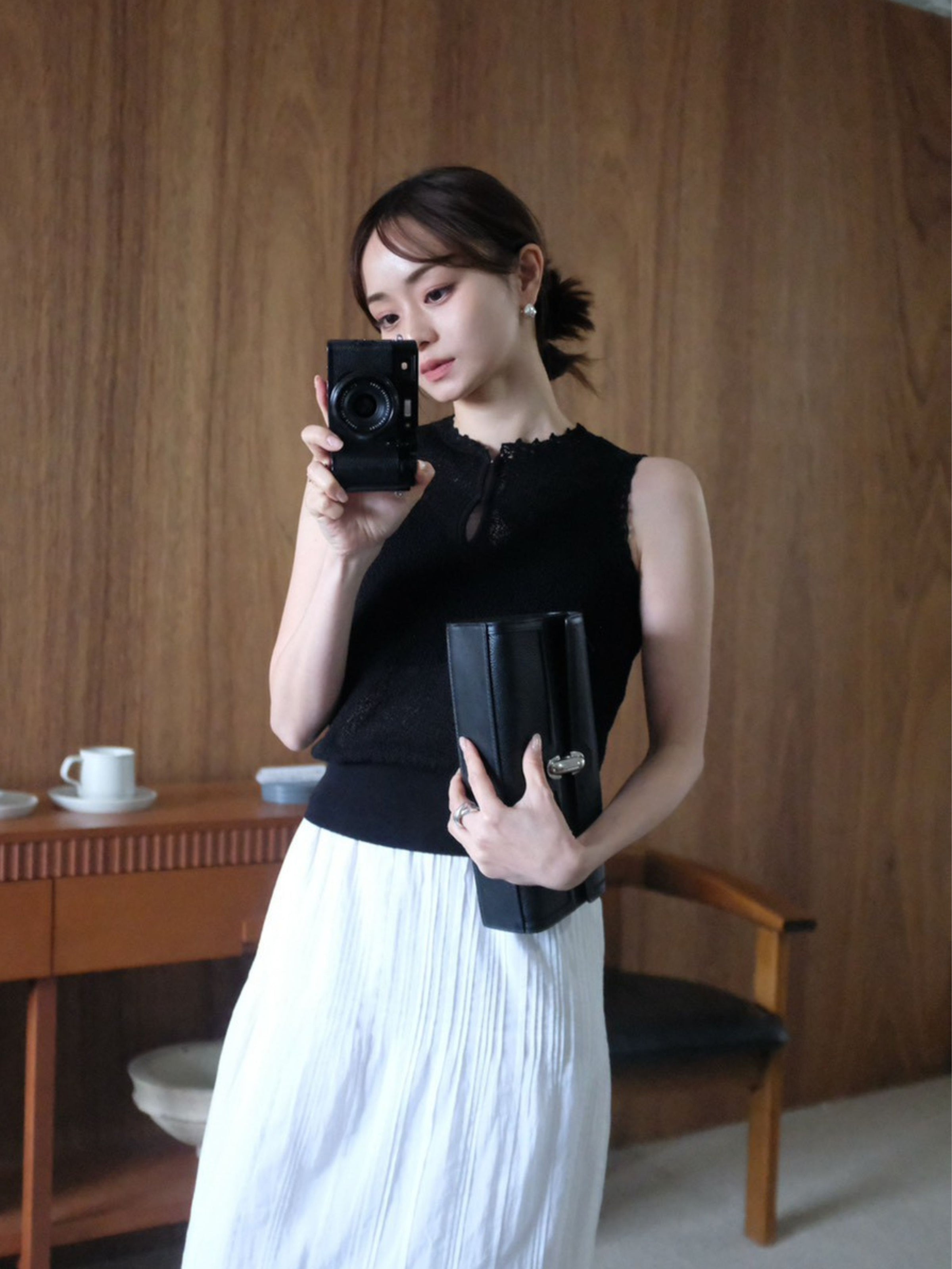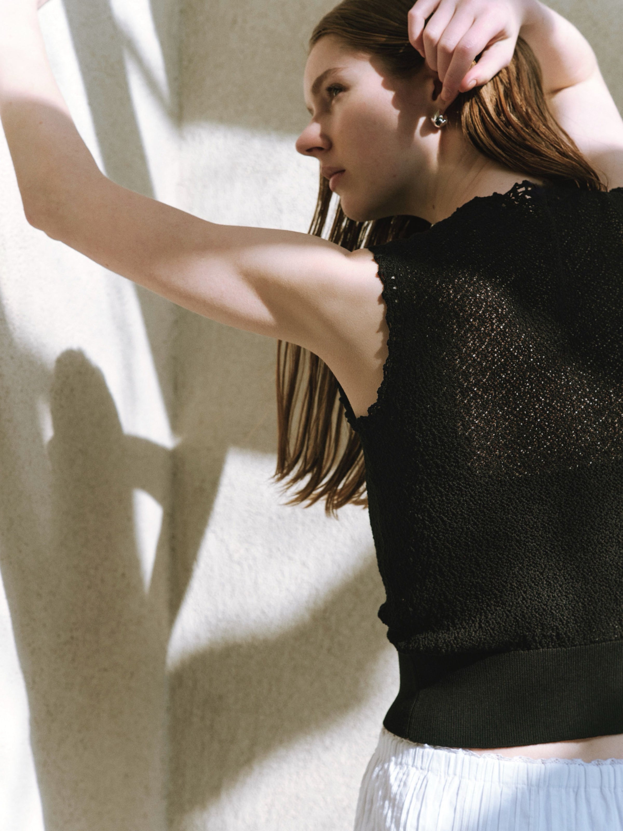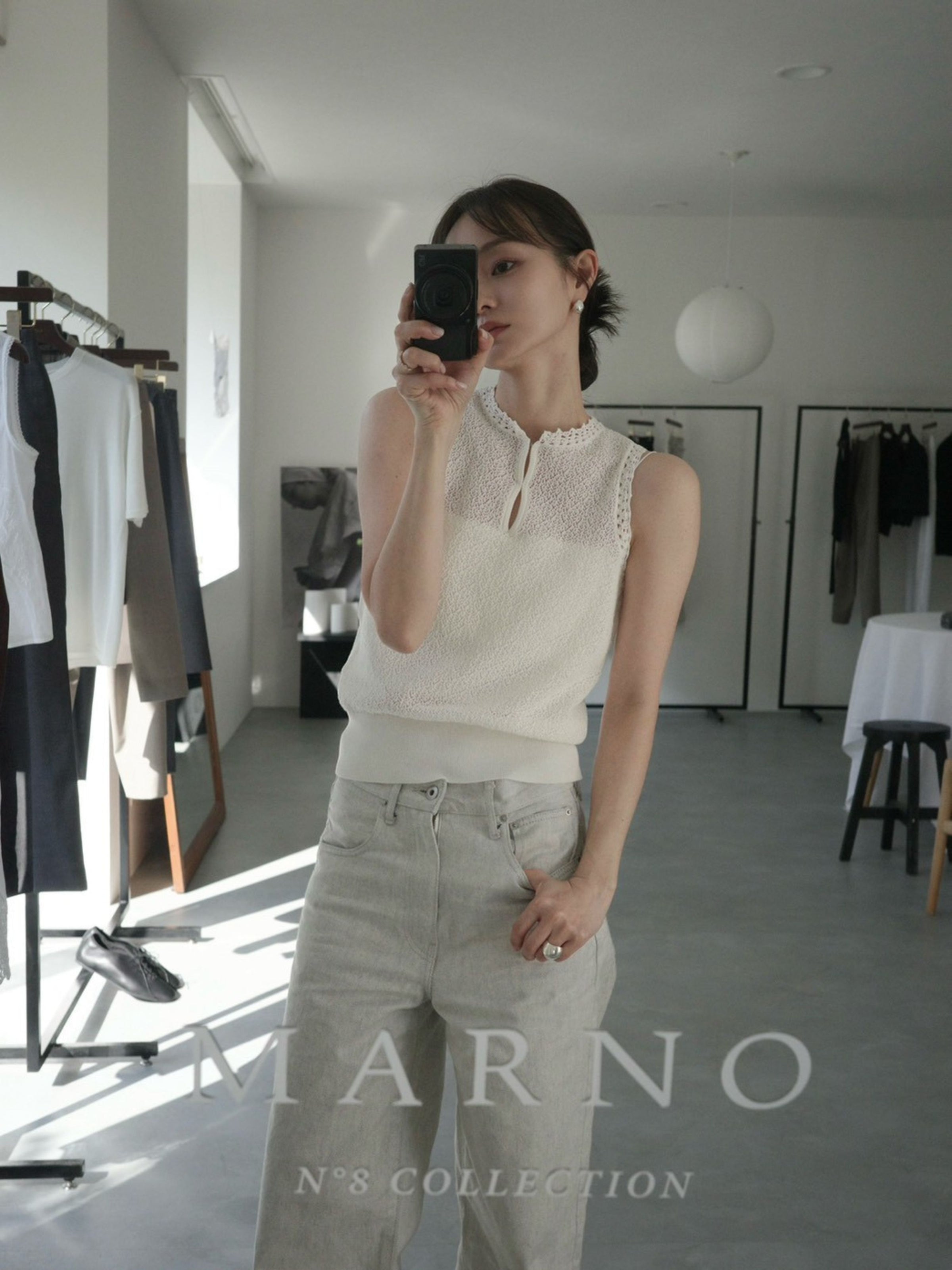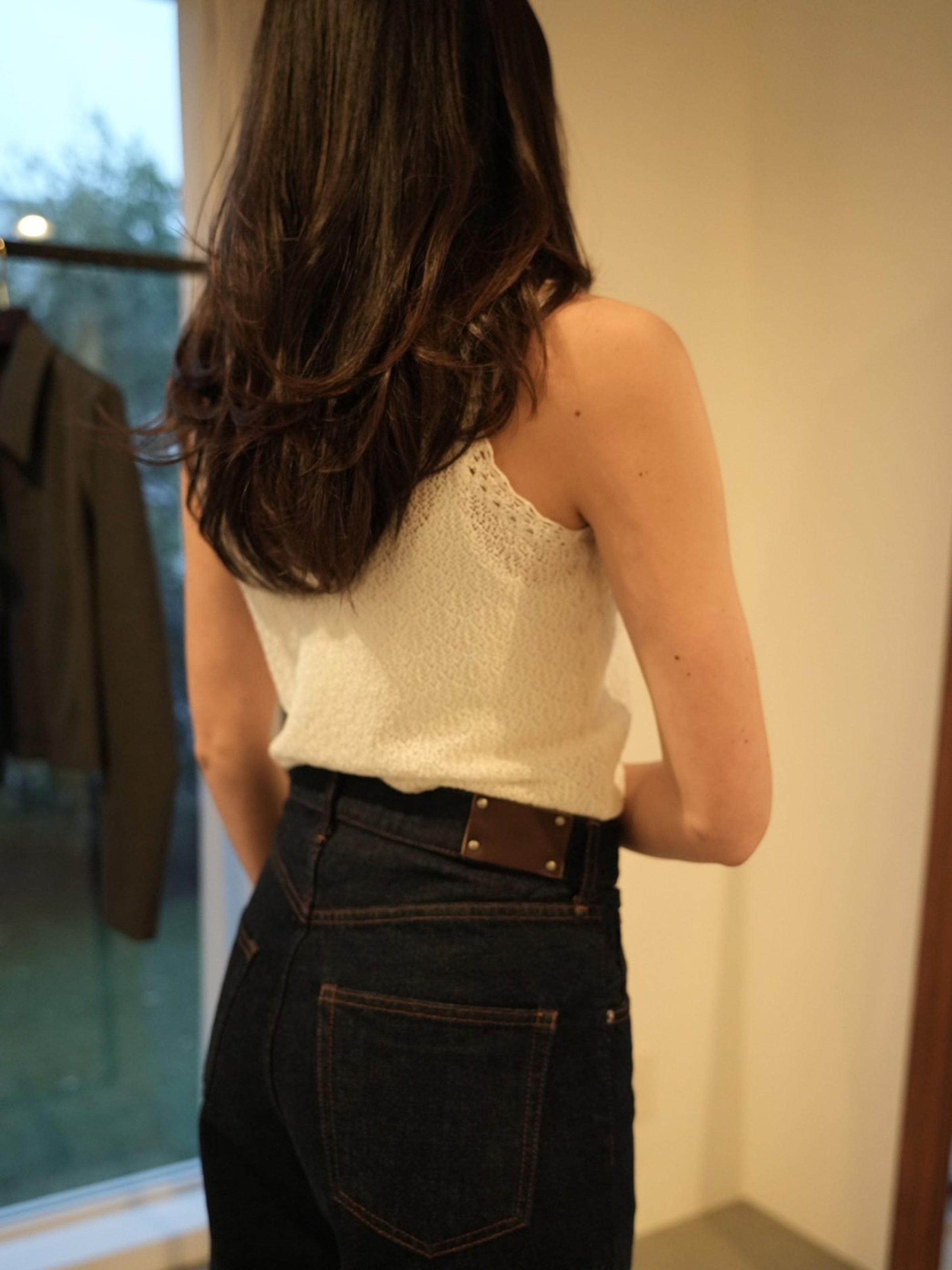 胸元のさりげない開きと、程よくコンパクトなシルエットがボトムとのバランスを取りやすく、一枚で自然とスタイリングが完成するデザイン。ウールのRémi pantsと合わせれば、静かで上品なムードに。Yves denimと合わせることで、程よく力の抜けたスタイリングも楽しめます。デイリーからオケージョンまで、シーンを選ばず活躍する、着映えと実用性を兼ね備えたレースニットです。