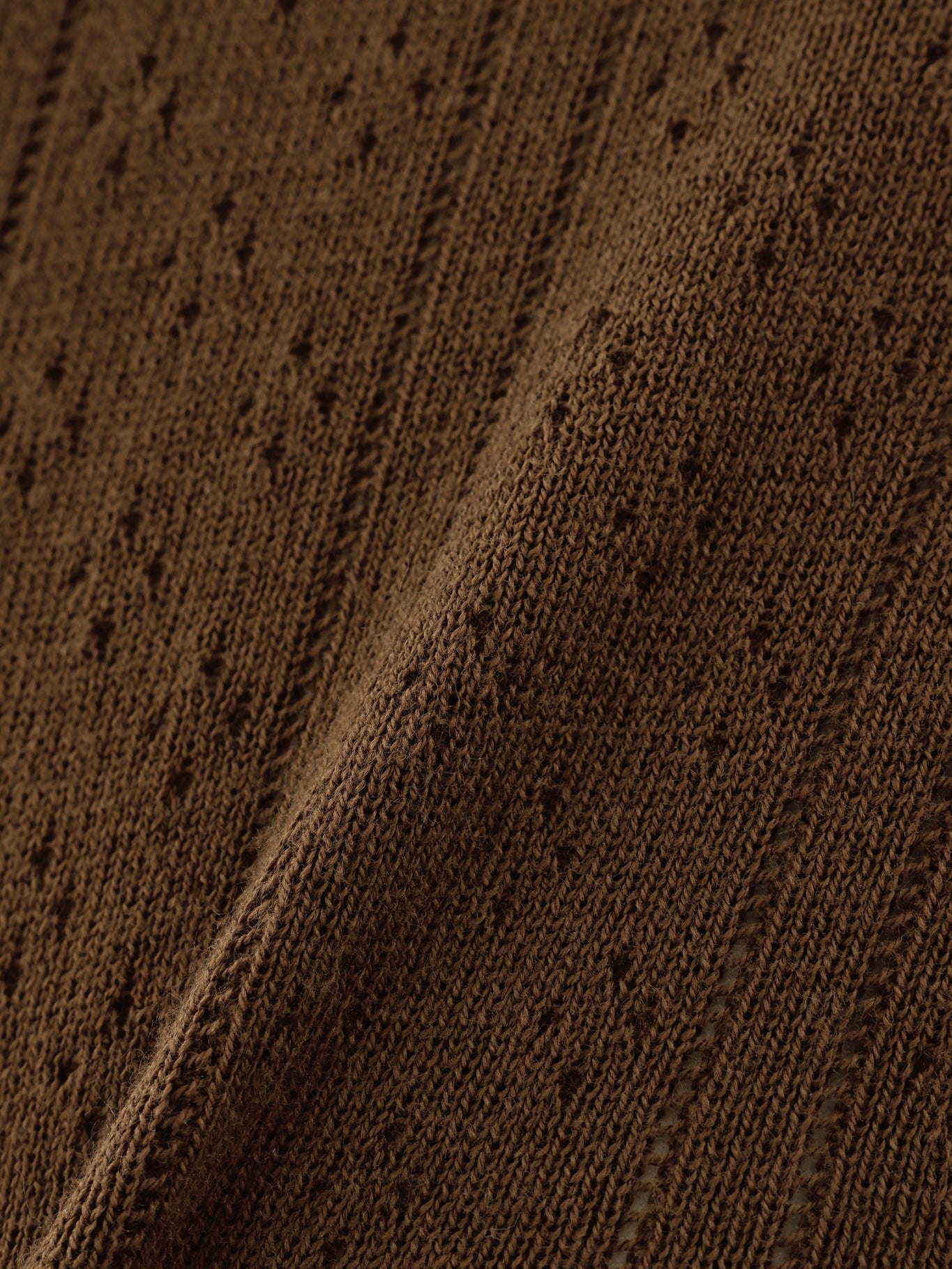環境にも肌にもやさしいオーガニックコットンを贅沢に使用しています。自然な風合いとしなやかな肌触りが魅力の上質素材で、繊細な透かし編みを施し、上品な抜け感と女性らしいニュアンスを纏わせました。