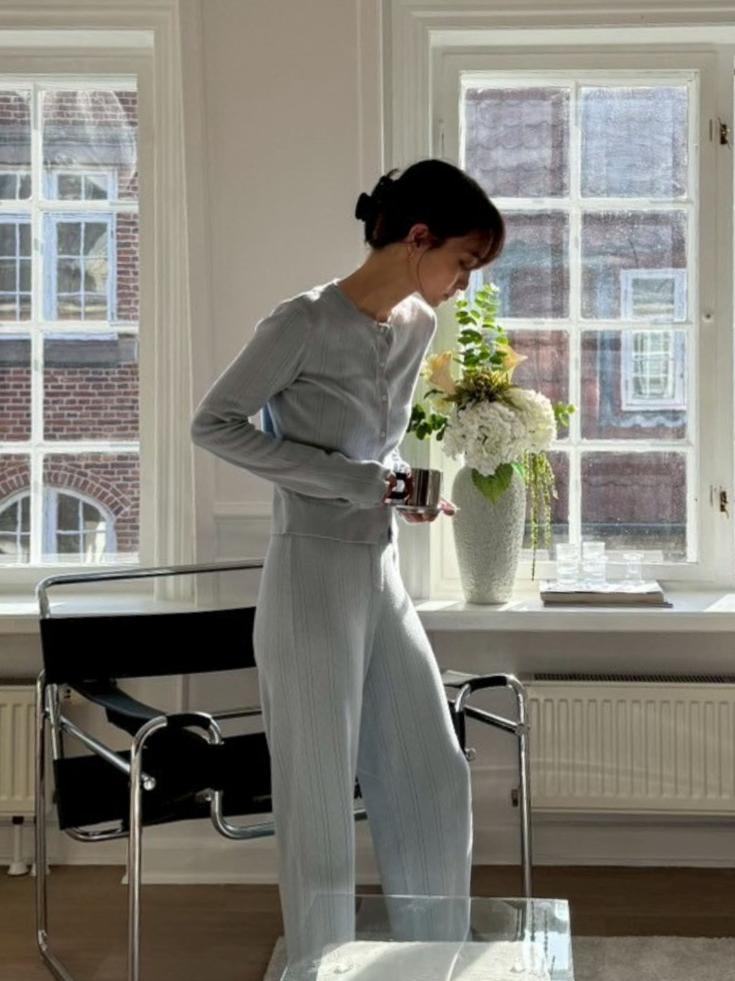 無駄を削ぎ落としたミニマルなシルエットながら、編地の美しさと素材のクオリティが際立ち、一枚で様になる存在感。ラウンドネックとフロントのシェルボタンが、クリーンで洗練された佇まいを引き立てます。日常に寄り添う心地よさと、上質さを兼ね備えた一着は、季節の変わり目の軽羽織としても、コーディネートの主役としても活躍します。大人のワードローブに、永く寄り添う逸品です。
