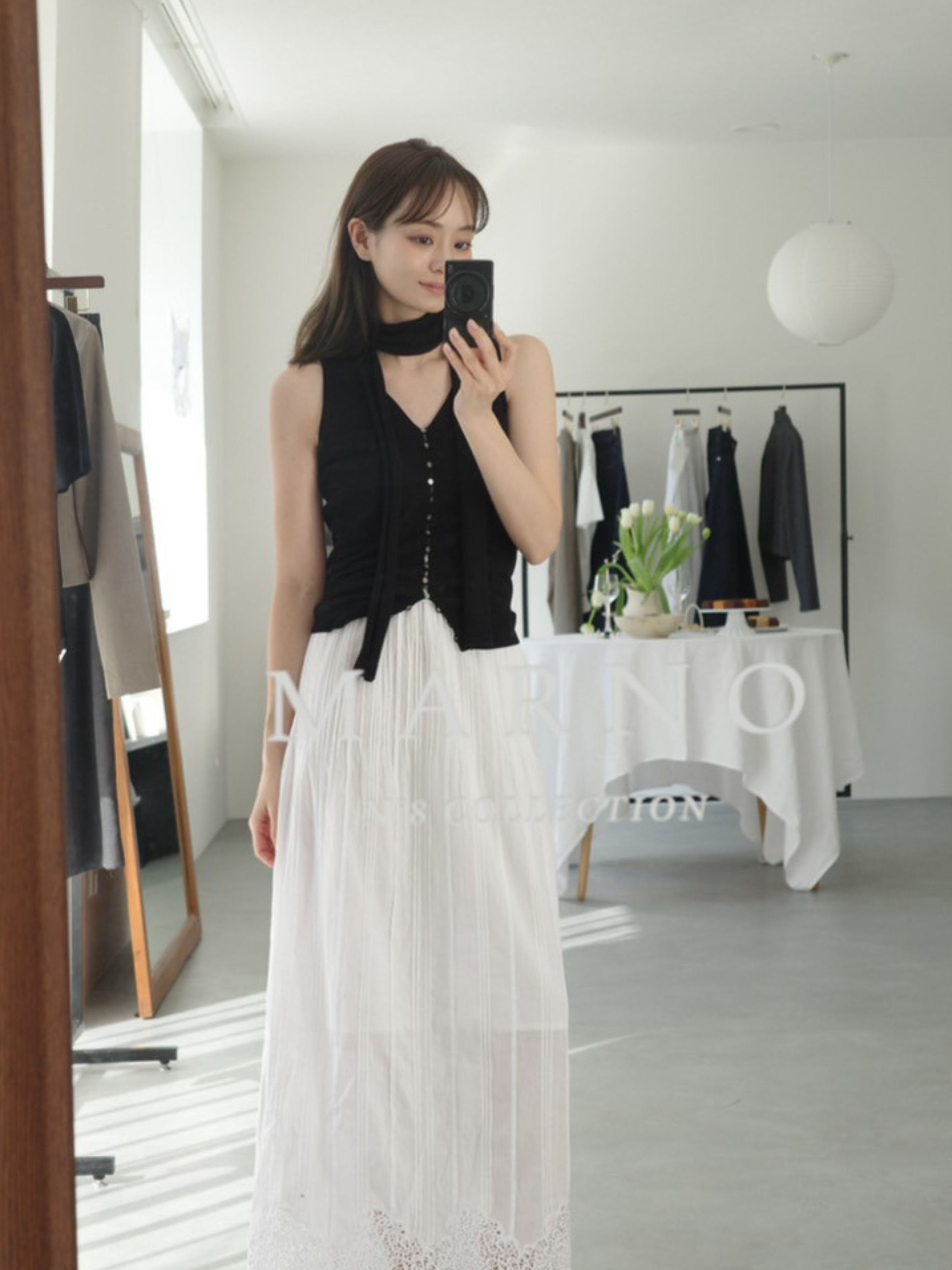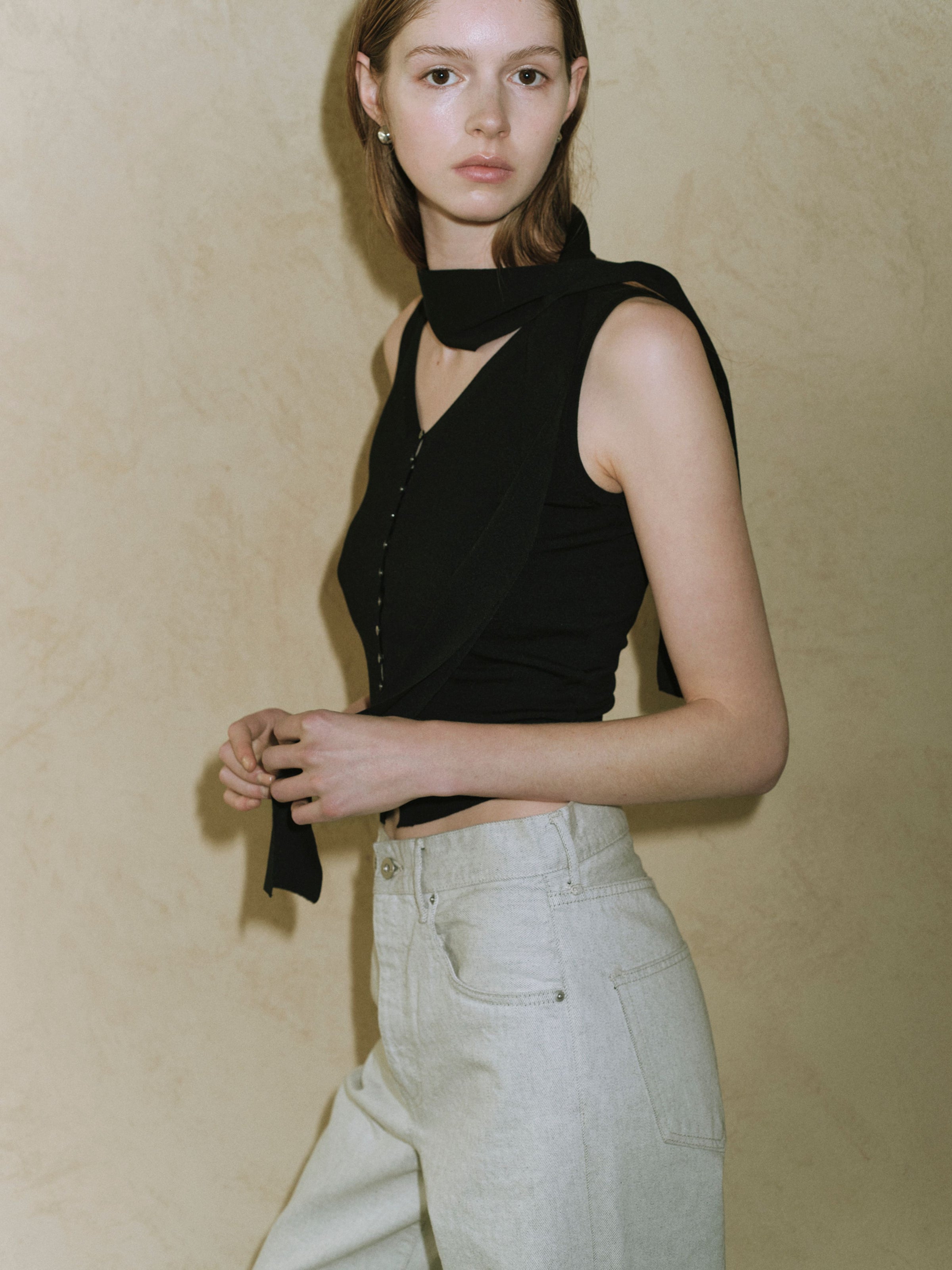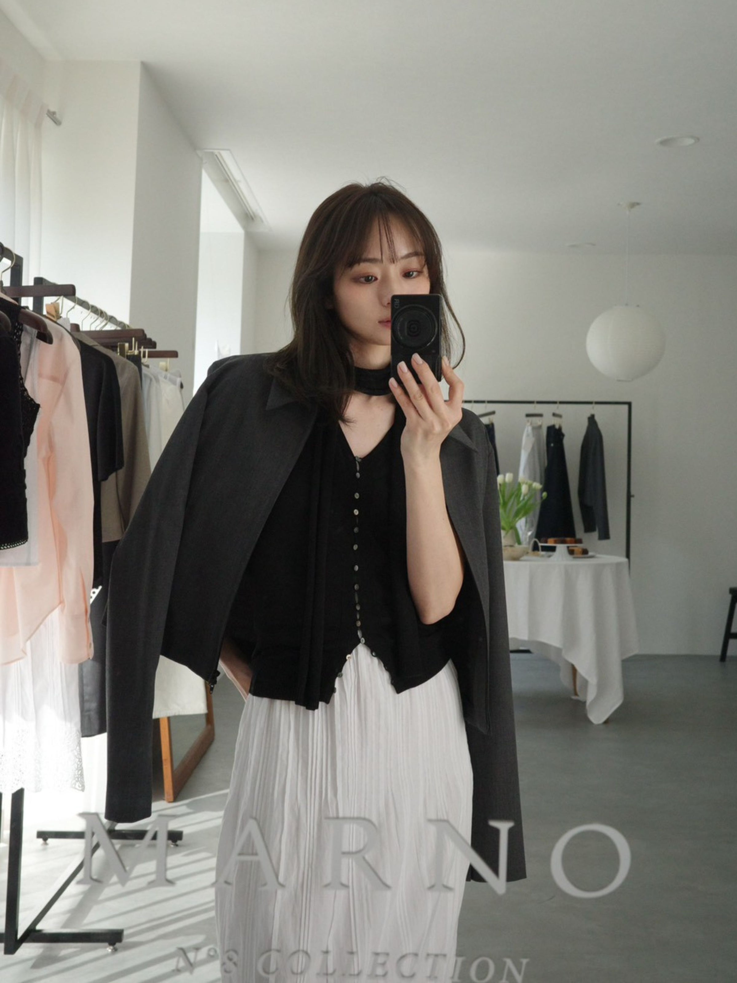 付属のボウタイは、結び方や垂らし方によってシャープにも、少し表情をつけることもでき、装いにリズムを生み出します。Ella jacketとのレイヤードでは、ミニマルな中に緊張感が生まれ、コレクションらしい透明感とモード感のバランスが完成します。