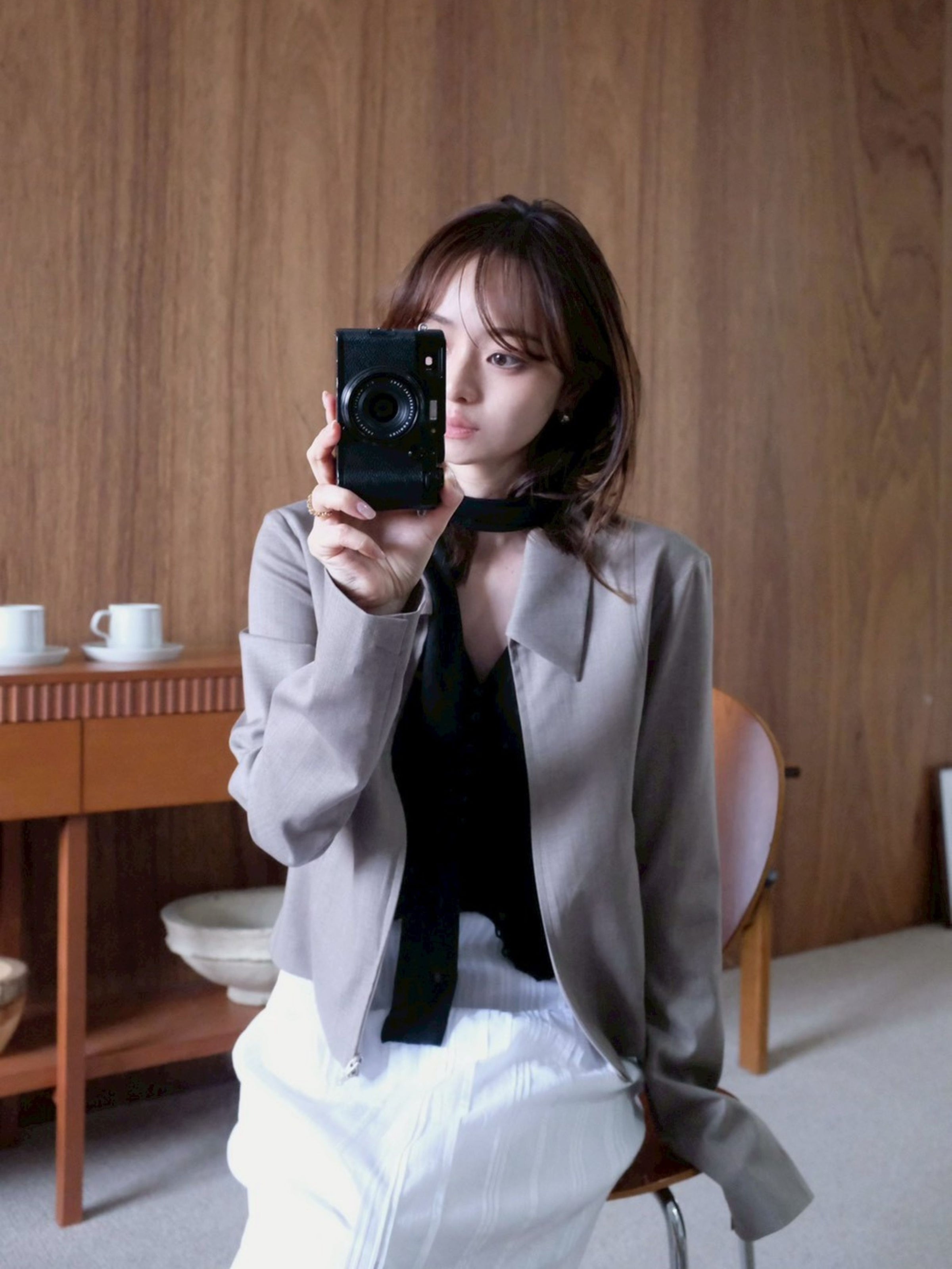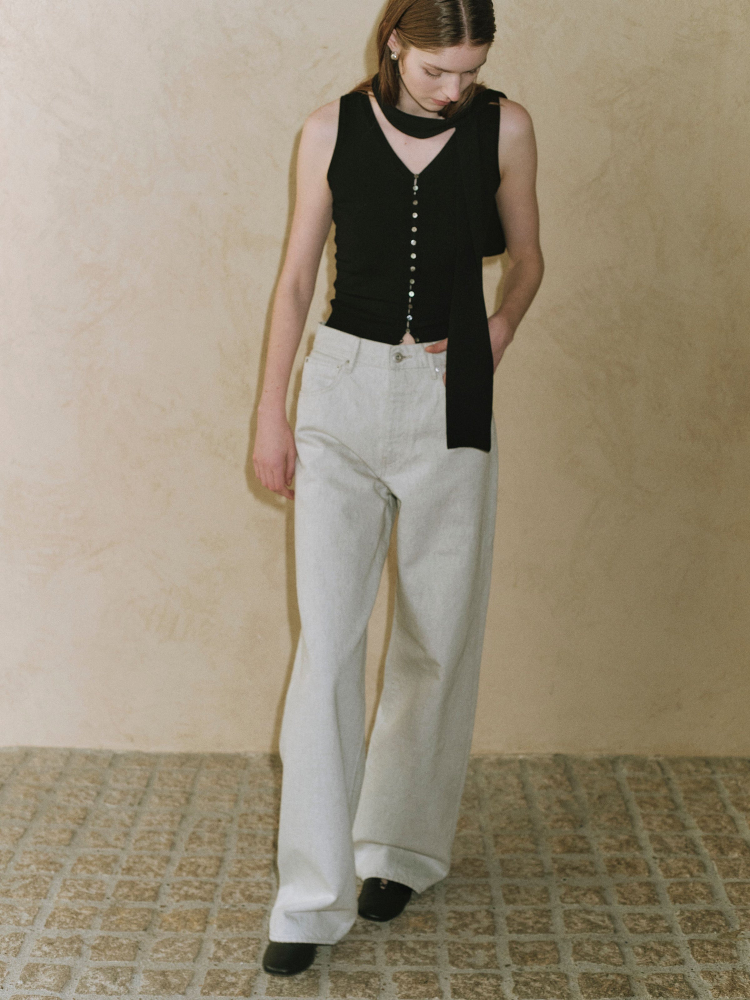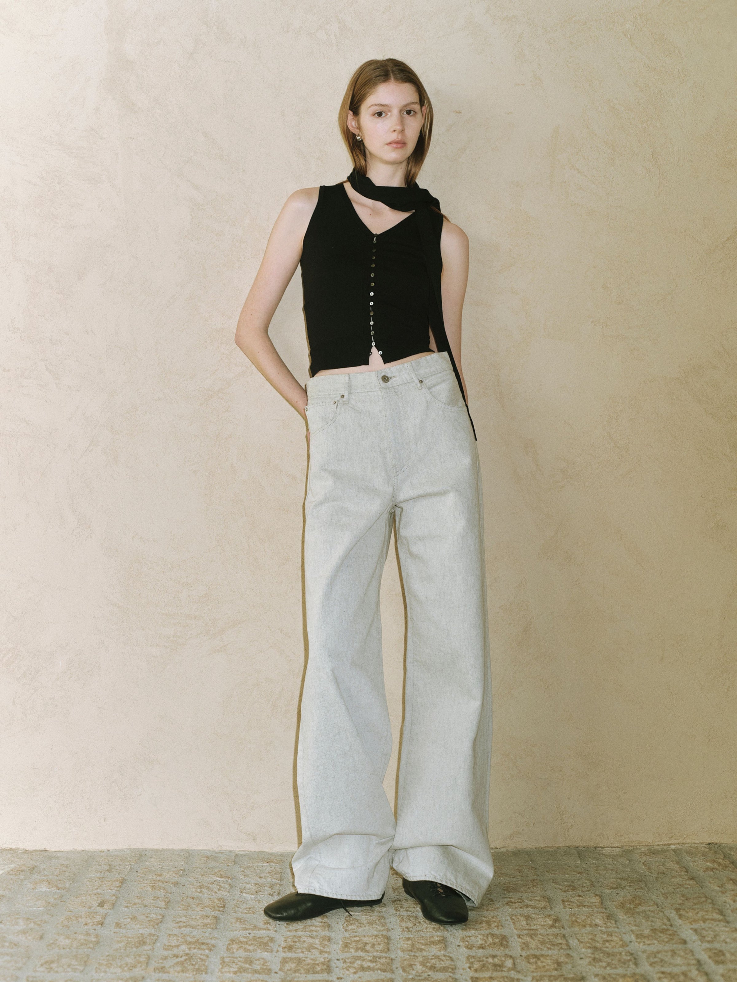 付属のボウタイは、結び方や垂らし方によってシャープにも、少し表情をつけることもでき、装いにリズムを生み出します。Ella jacketとのレイヤードでは、ミニマルな中に緊張感が生まれ、コレクションらしい透明感とモード感のバランスが完成します。