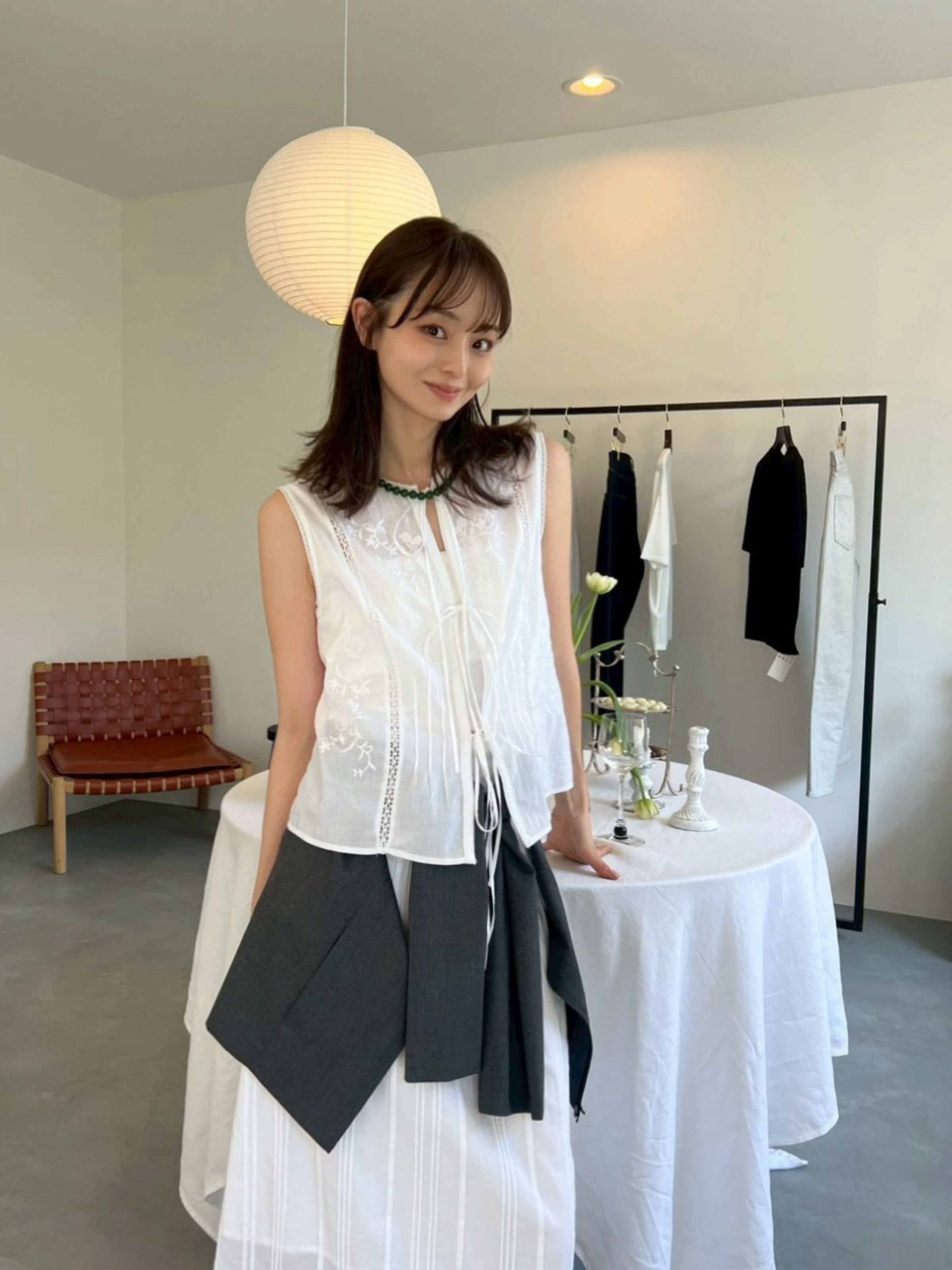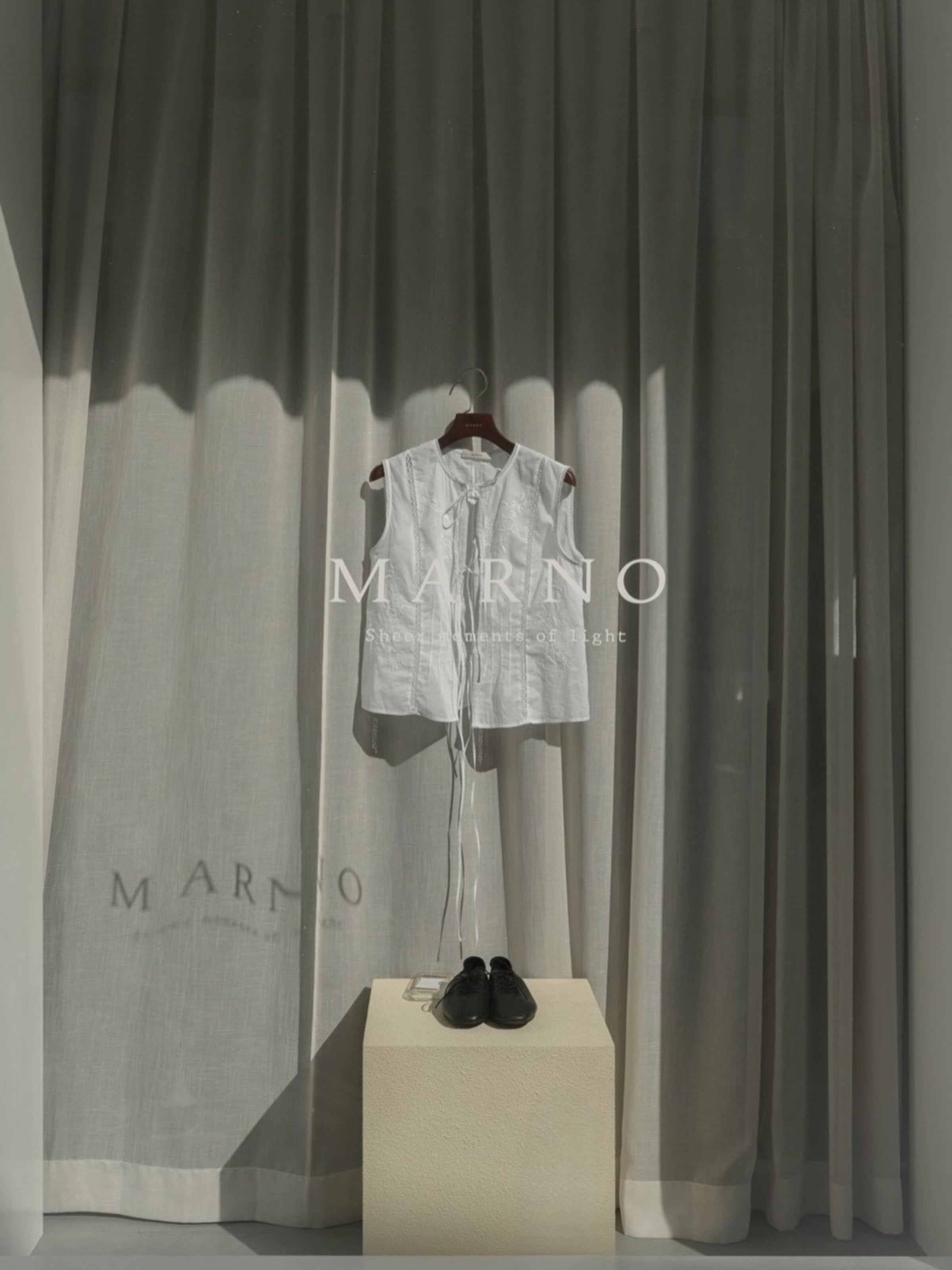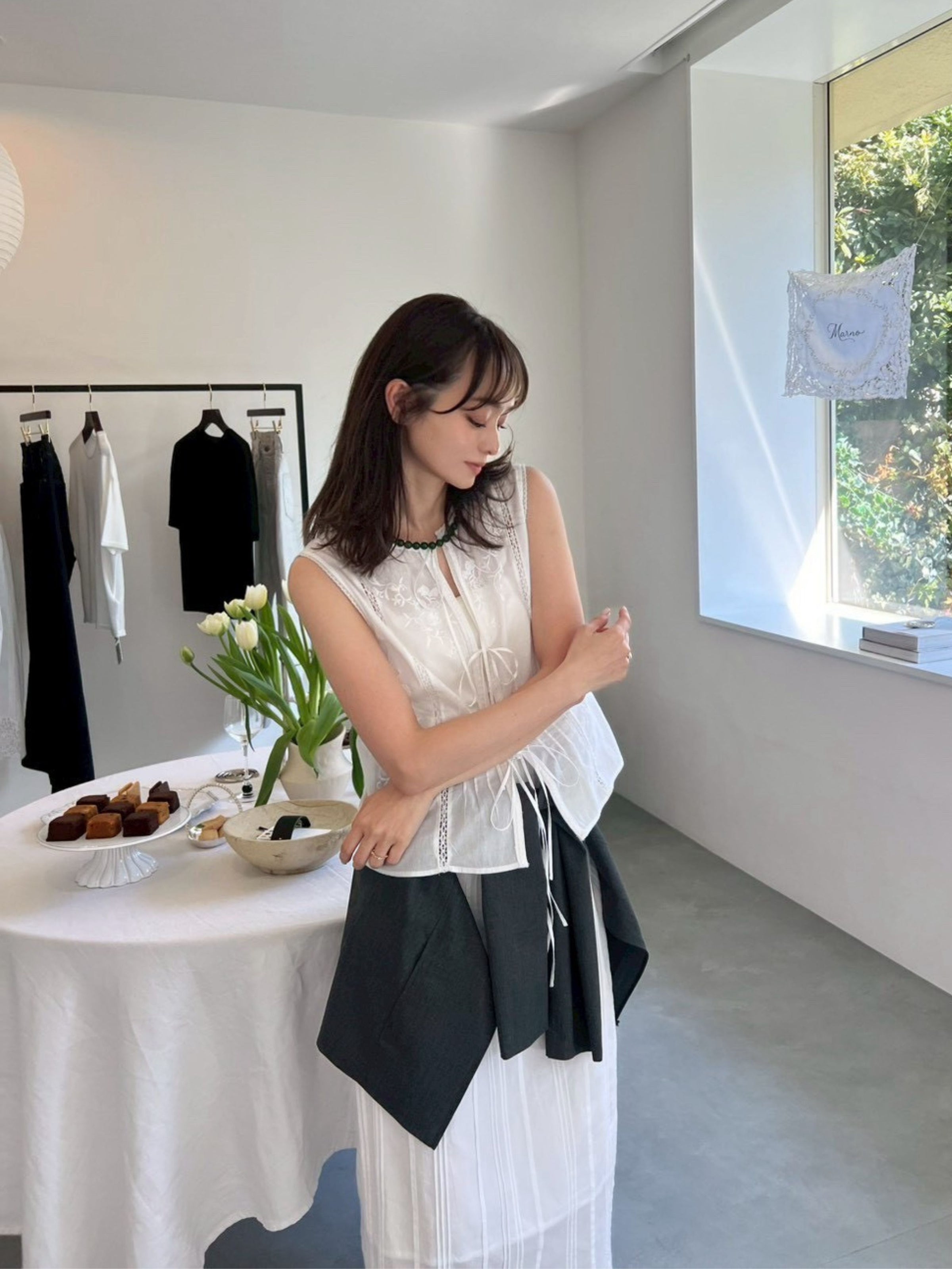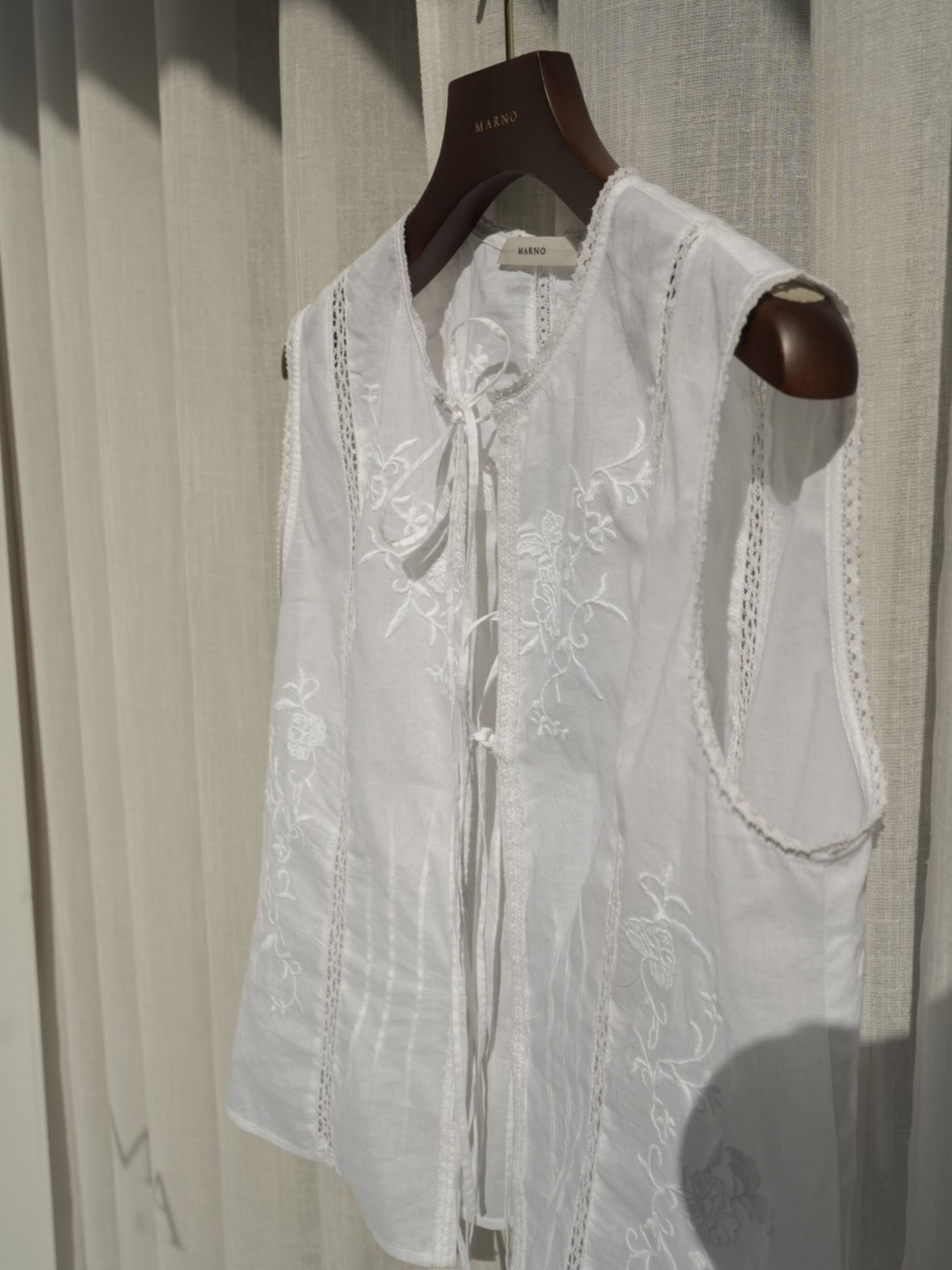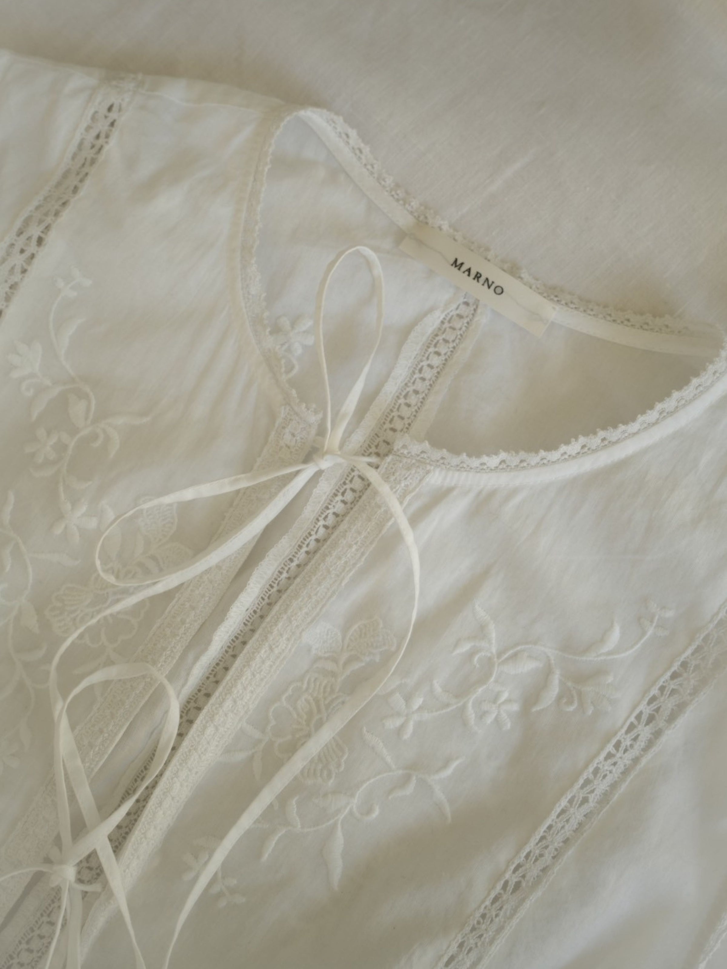 3種類のオリジナル柄を組み合わせ、肌と空気のあいだに余白をつくるように配置したデザイン。インドならではの軽やかさと抜け感の中に、MARNOらしい繊細なバランス感覚を落とし込んでいます。直線的で力の抜けたシルエットにより、レースや刺繍の装飾性を、あくまで日常のスタイリングとして自然に取り入れられる一着に。