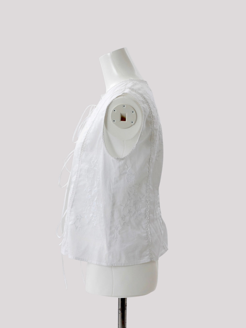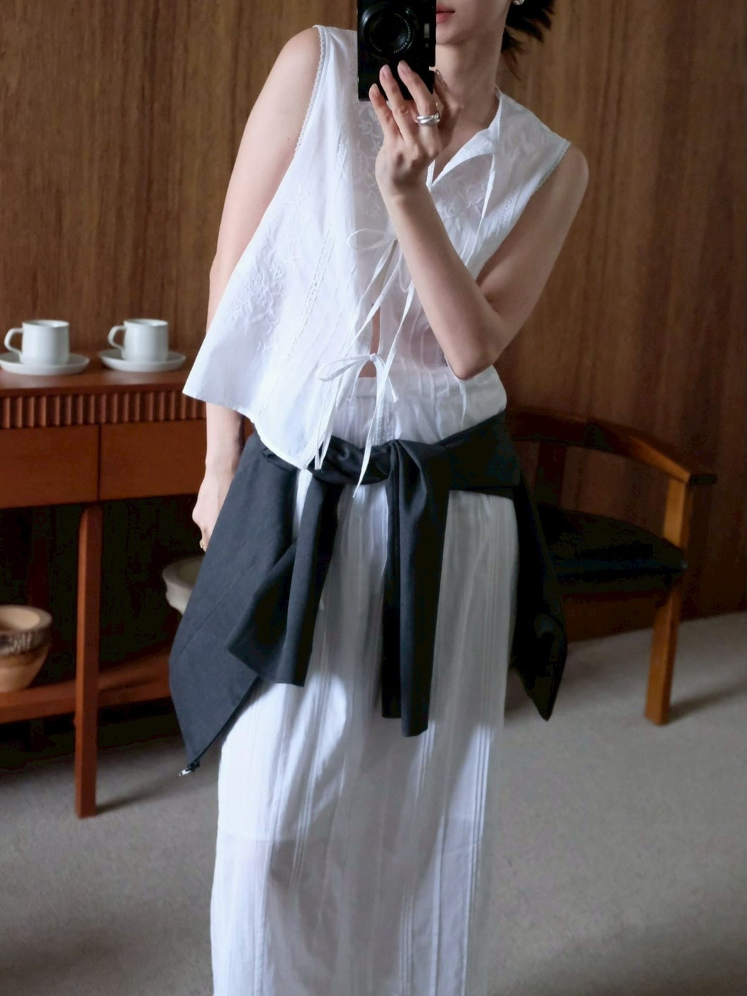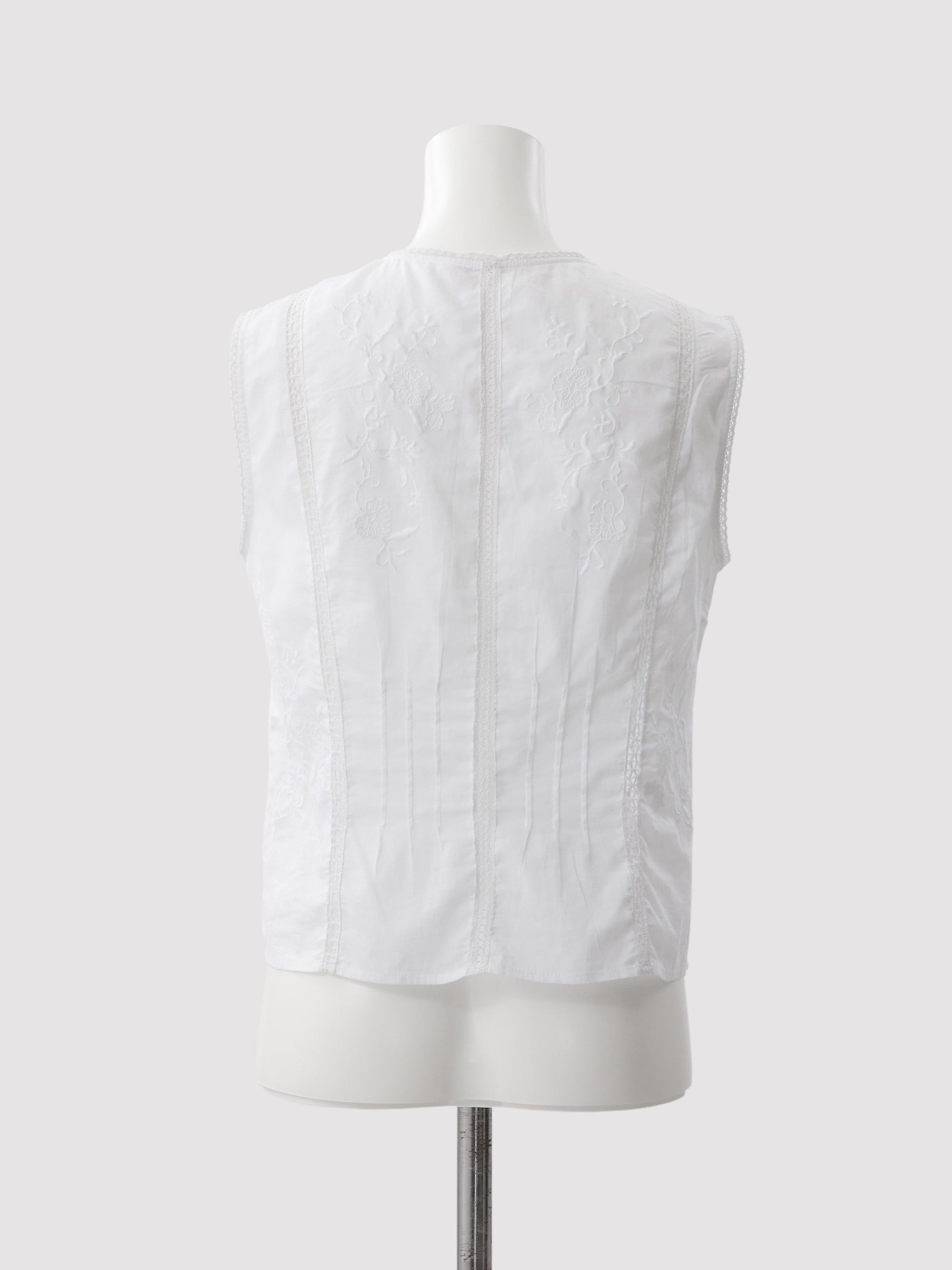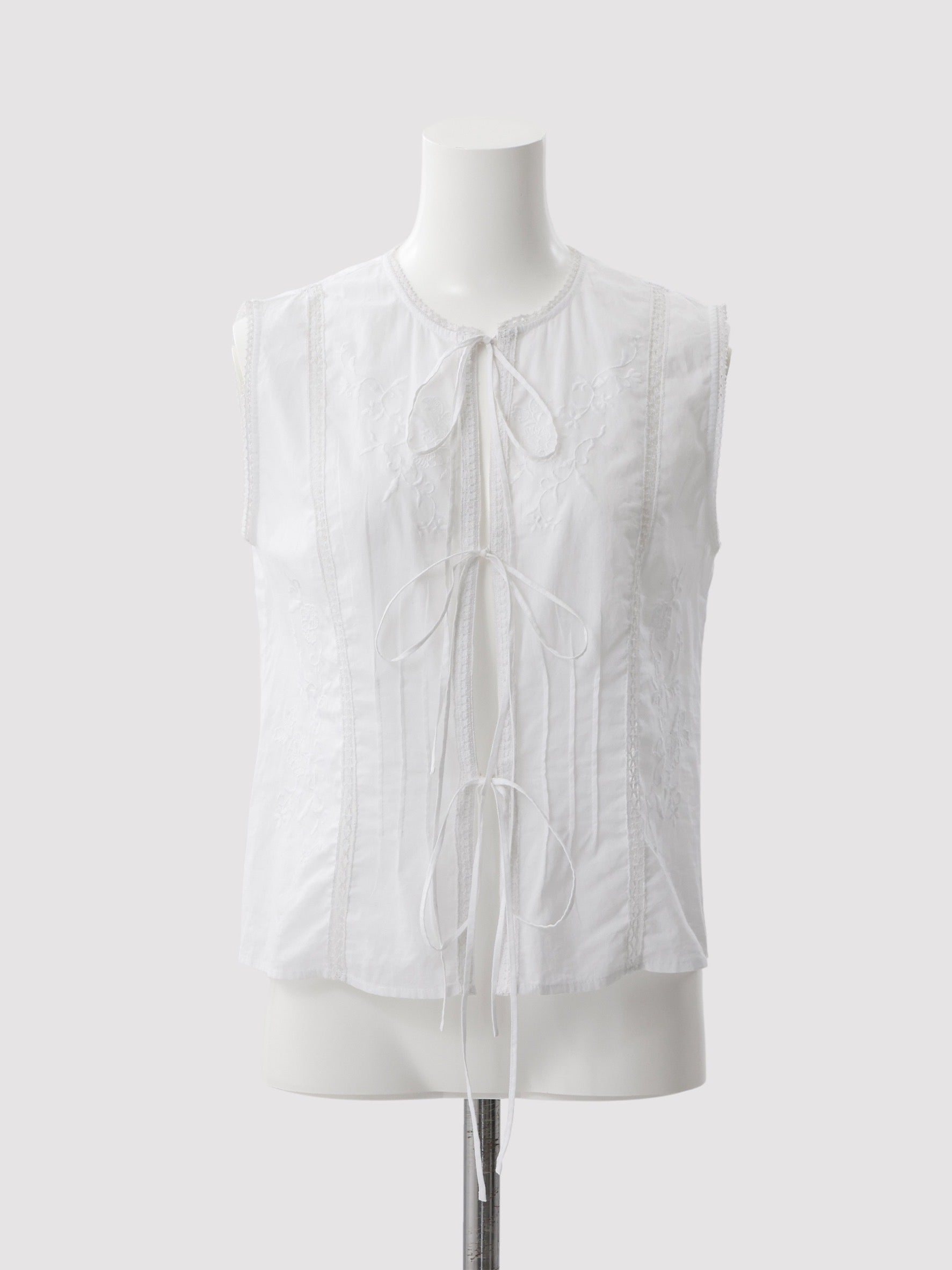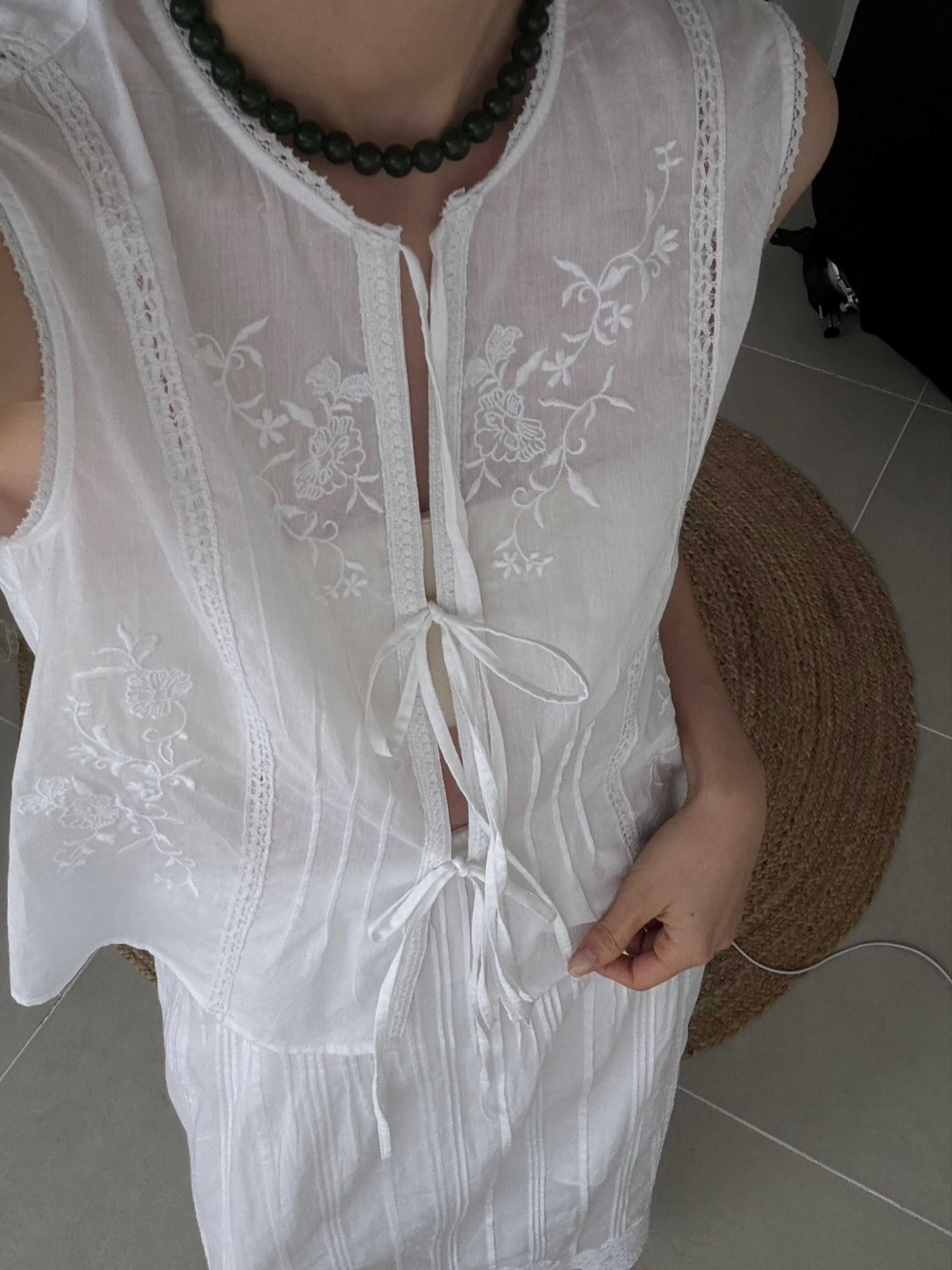 3種類のオリジナル柄を組み合わせ、肌と空気のあいだに余白をつくるように配置したデザイン。インドならではの軽やかさと抜け感の中に、MARNOらしい繊細なバランス感覚を落とし込んでいます。直線的で力の抜けたシルエットにより、レースや刺繍の装飾性を、あくまで日常のスタイリングとして自然に取り入れられる一着に。