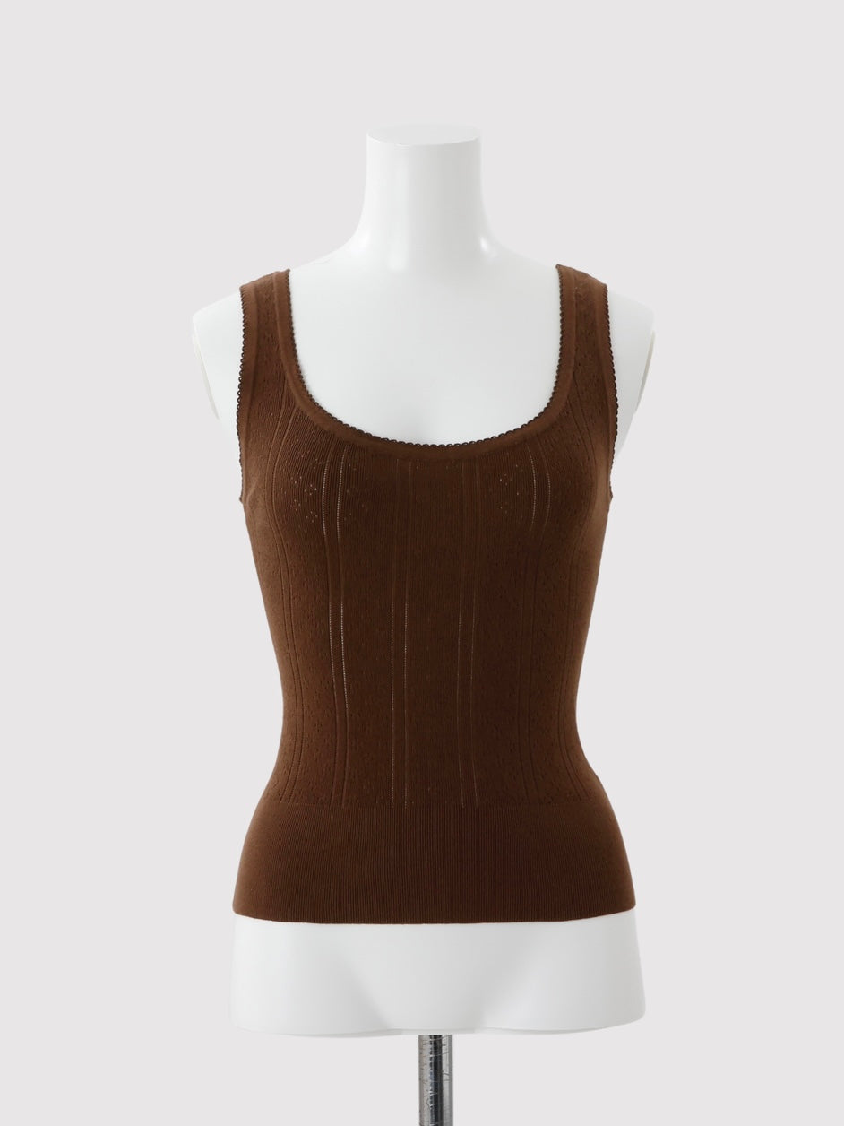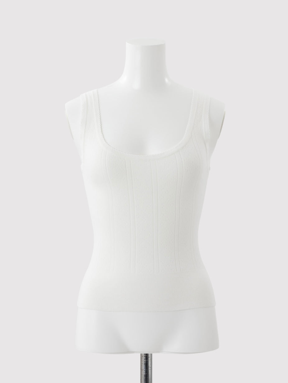 MARNOオリジナルで描いたレースのような繊細な透かし編みと、計算されたシルエットが美しく調和したニットタンク。程よくフィットするシルエットが身体のラインを美しく見せつつ、窮屈さを感じさせない着心地にこだわりました。