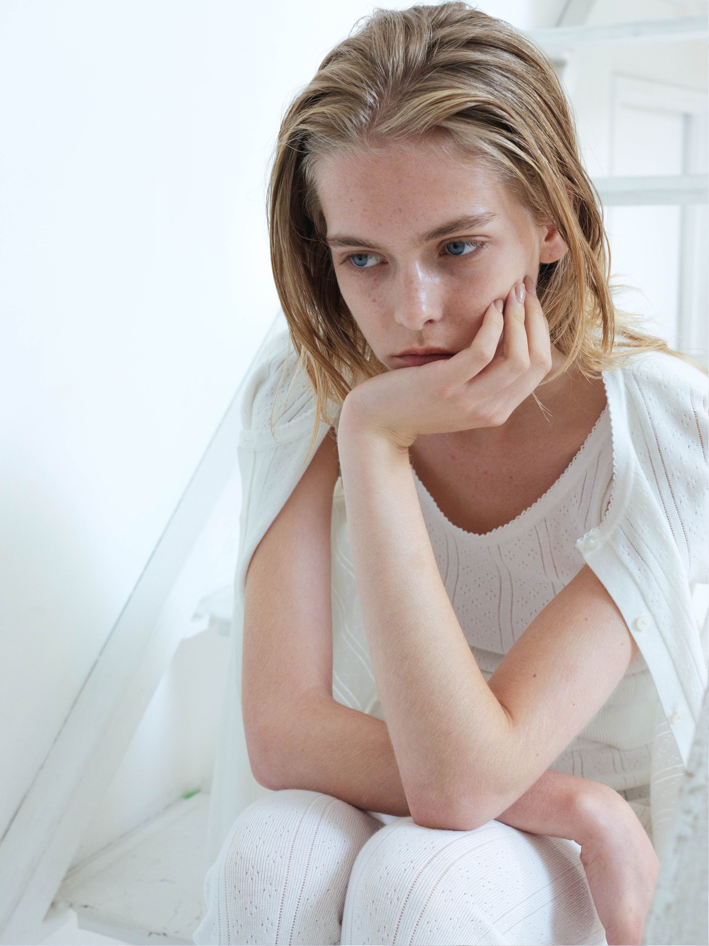 環境にも肌にもやさしい、オーガニックコットンを贅沢に使用しています。自然な風合いとしなやかな肌触りが魅力の上質素材で、繊細な透かし編みを施し、襟ぐりのピコ刺繍で上品な抜け感と女性らしいニュアンスを纏わせました。